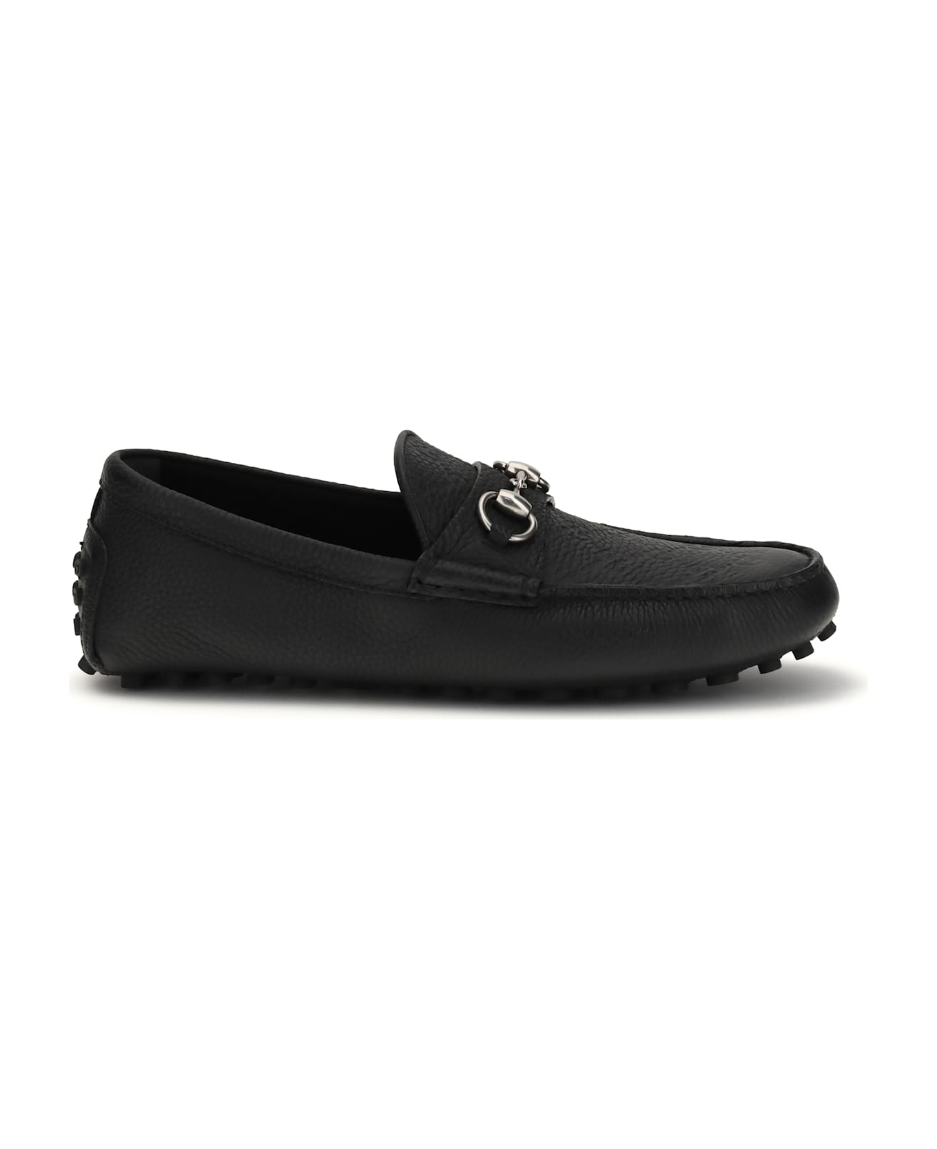 The horsebit driver loafers by gucci are crafted from black embossed leather and reflect timeless elegance. silver-tone hardware and the iconic horsebit on the front add a distinctive touch, while the rubber sole with grommets ensures comfort and grip, making them ideal for refined everyday wear. Composition: 100% % Calf Leather Bos Taurus