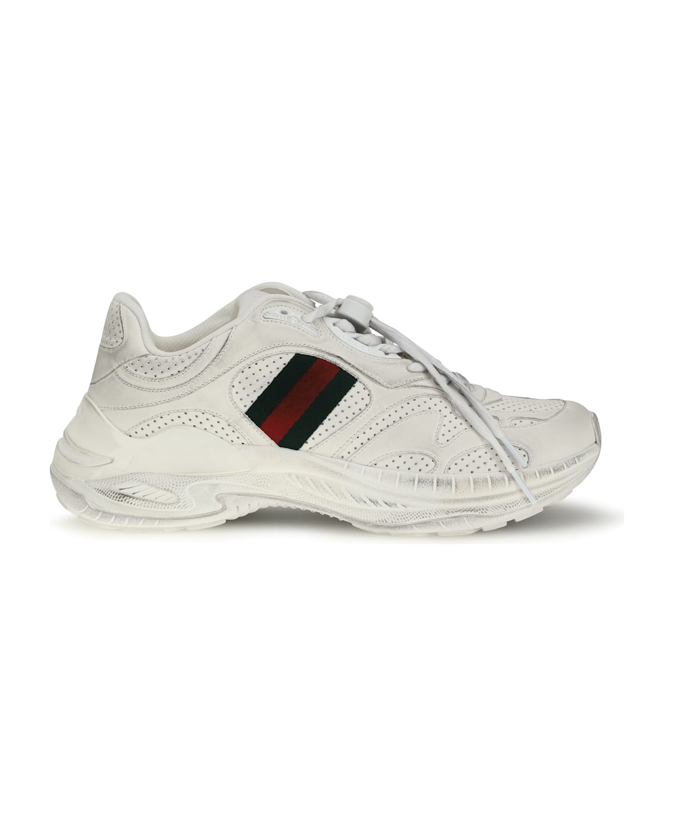 The 2. 0 sneakers by gucci in white leather with a faded effect strike the perfect balance between contemporary style and premium comfort. featuring a leather lining and the iconic web ribbon, these low-top sneakers offer a stable fit thanks to the eva and tpu sole with a gg pattern. the lace-up closure system with drawstring and gg cross, along with additional interchangeable laces, allows for versatile customization to suit any look, making them ideal for those seeking luxury sneakers with a distinctive and functional design.