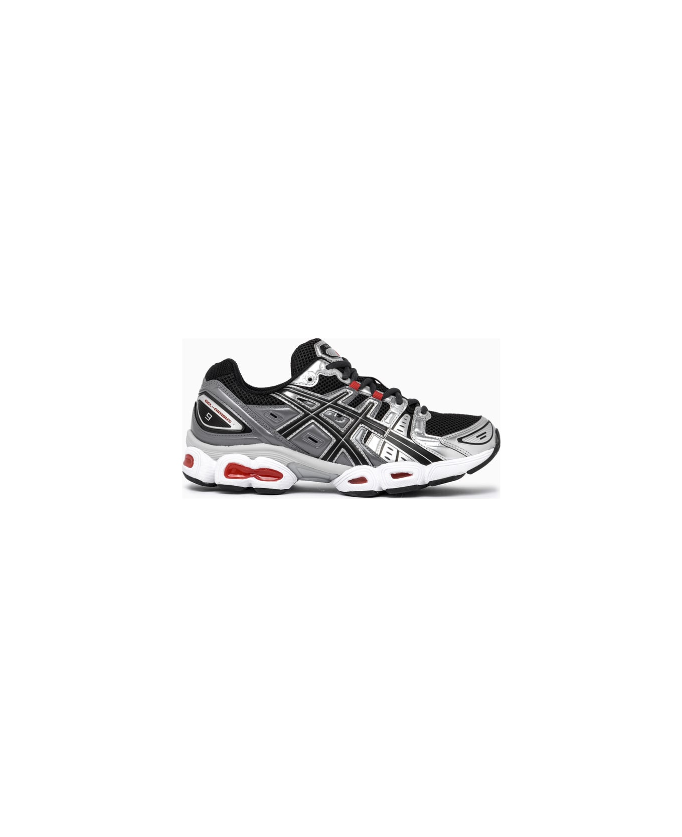 gel nimbus 9 running sneakers. upper in layered mesh with tpu and leather inserts. laces at front. lightly padded tongue with logo detailing. iconic asics stripes at both sides. padded ankle collar. reinforced back patch with logo insert in tpu. textile lining and insole. segmented midsole with gel inserts for optimal cushioning. rubber sole with tpu detail. height of sole: 2-3 cm. us size system.