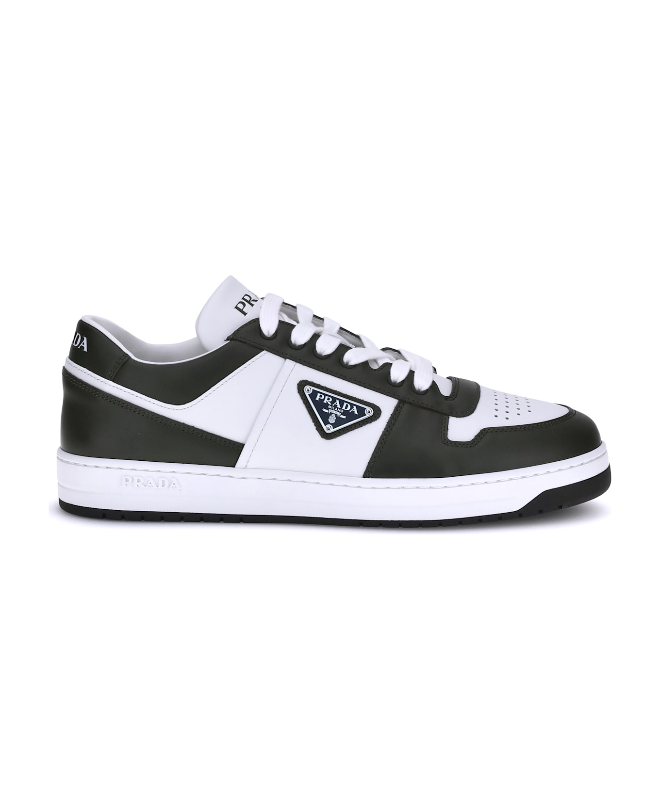 Stylish and contemporary leather downtown sneakers by prada, these sneakers feature a front lace-up closure and the brand's signature enameled triangular logo plaque applied to the side panel. the round, perforated toe ensures breathability, while the contrasting logo on the heel adds a distinctive detail. perfect for an urban and sophisticated look. Composition: 100% % Calf Leather Bos Taurus, 100% % Rubber