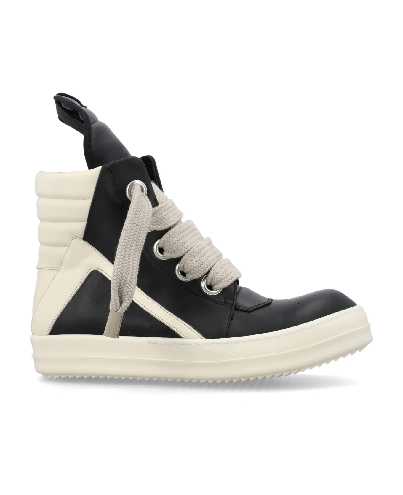 Leather Geobasket By Rick Owens. Featuring: Semi-shine Finish Leather Above-ankle Height Seven Eyelets Lace-up Fastening Extended Tongue Zip Fastening On The Inside Ankle Geometric Seams With Topstitching Quilted And Padded Collar Shark-tooth Sole