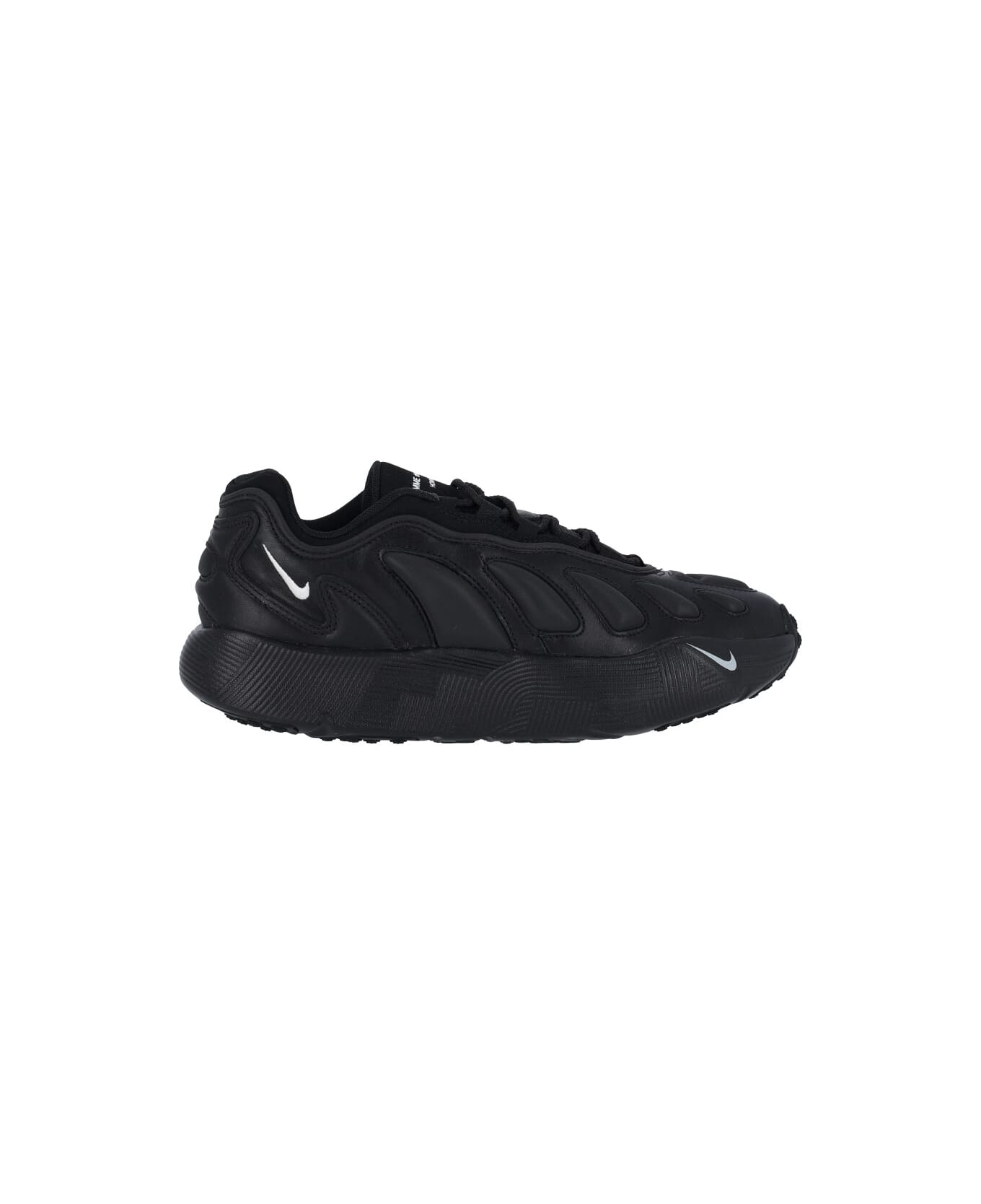 Comme Des Garçons Homme Plus X Nike 'Sense 96 sneakers, in black leather, mesh trim, round toe, contrasting Swoosh logo detail, lace-up closure, contrasting logo embroidery on tongue, contrasting Swoosh logo embroidery on side, textured rubber sole, contrasting Swoosh logo print detail on front.