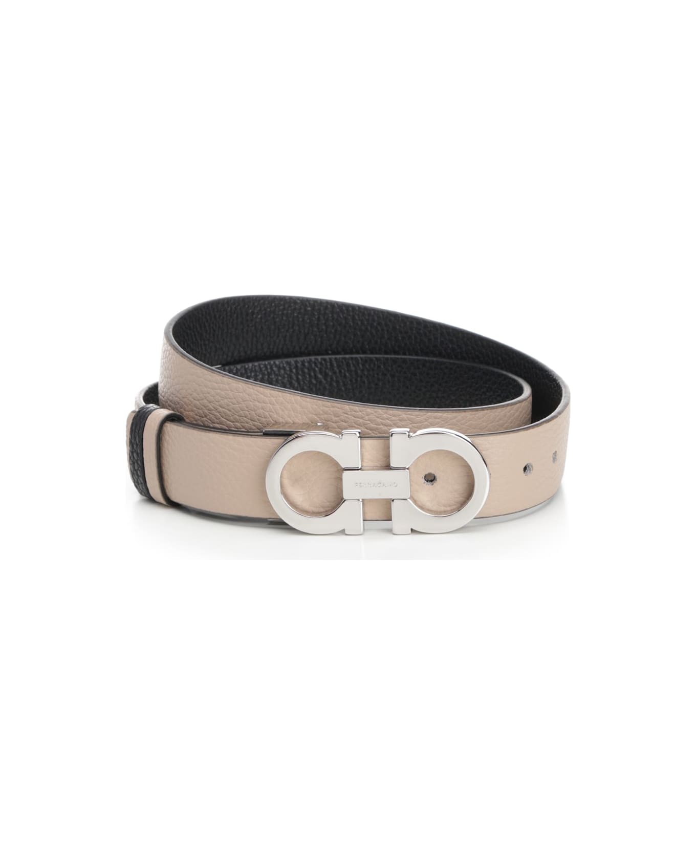 "Gancini" buckle belt in two-tone grained leather from Ferragamo.
