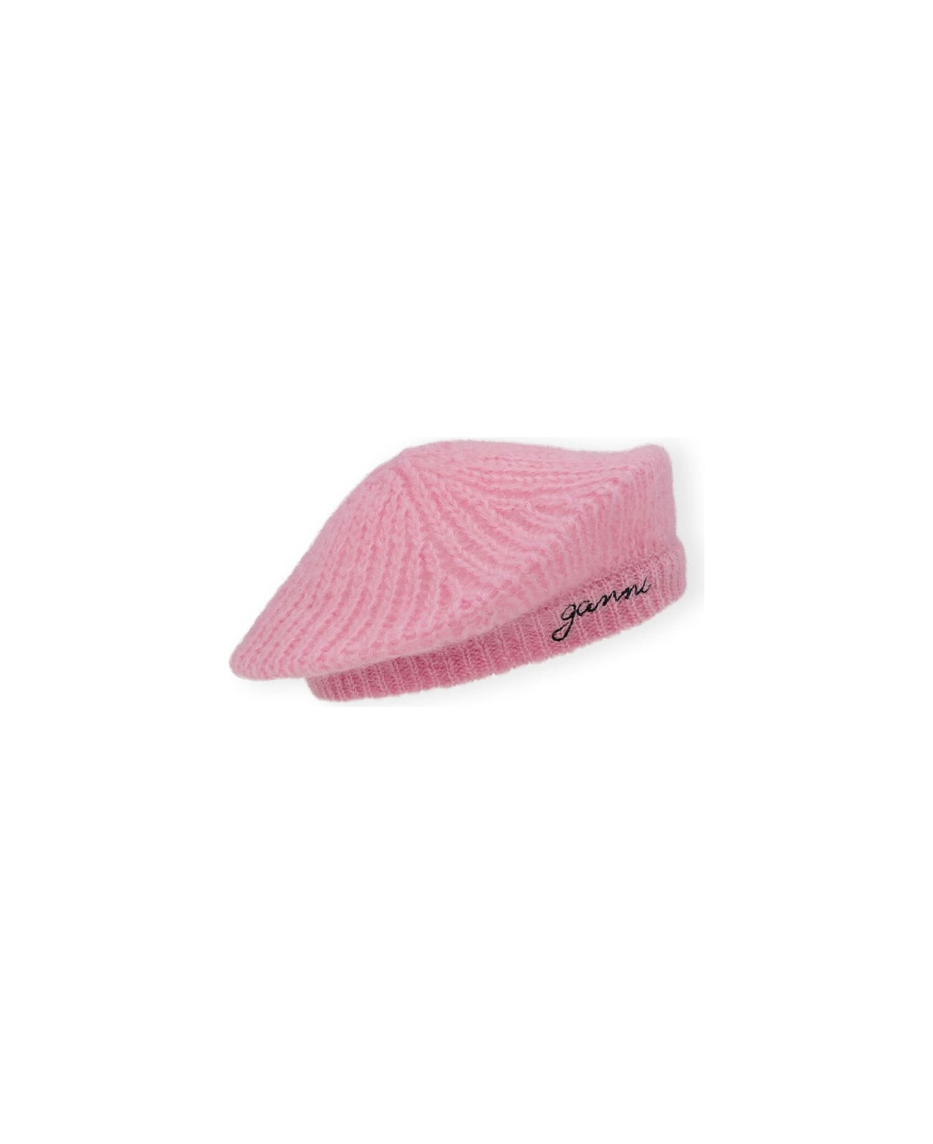 Beret by Ganni made of pink mohair blend with contrasting embroidered logo.