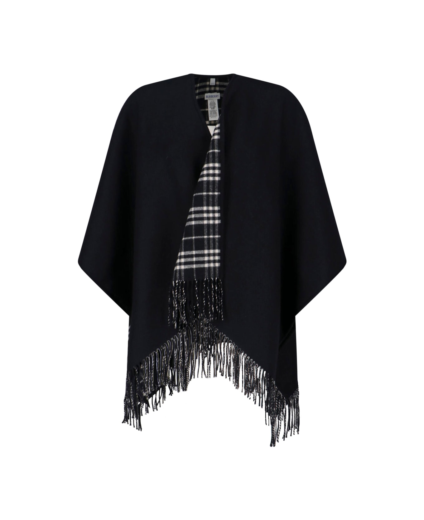 Burberry 'Check' reversible black wool cape on one side, multicolour 'Check' logo pattern on the other, fringed trims, asymmetrical hem.