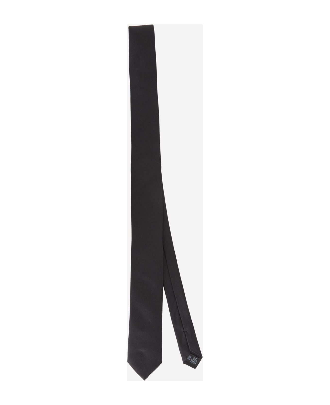 Black silk tie with pointed tip. Single loop on the back with branded label.