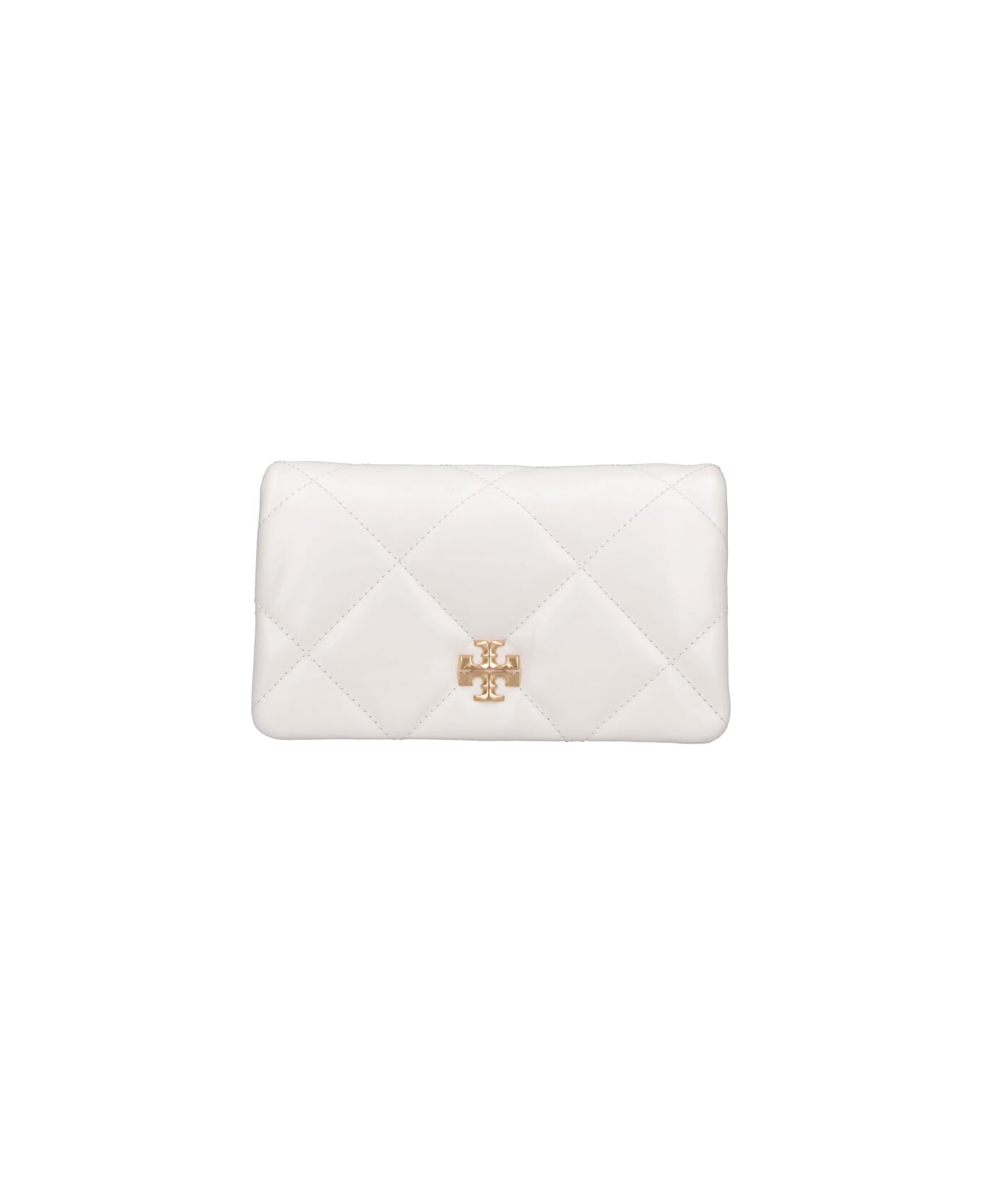- Chain wallet "Kira" Tory Burch in white calfskin - all-over quilted pattern - front flap closure - gold metal chain shoulder strap - "Double T" logo in gold metal on the front - one flat pocket on the back - one internal zip pocket - one main internal compartment