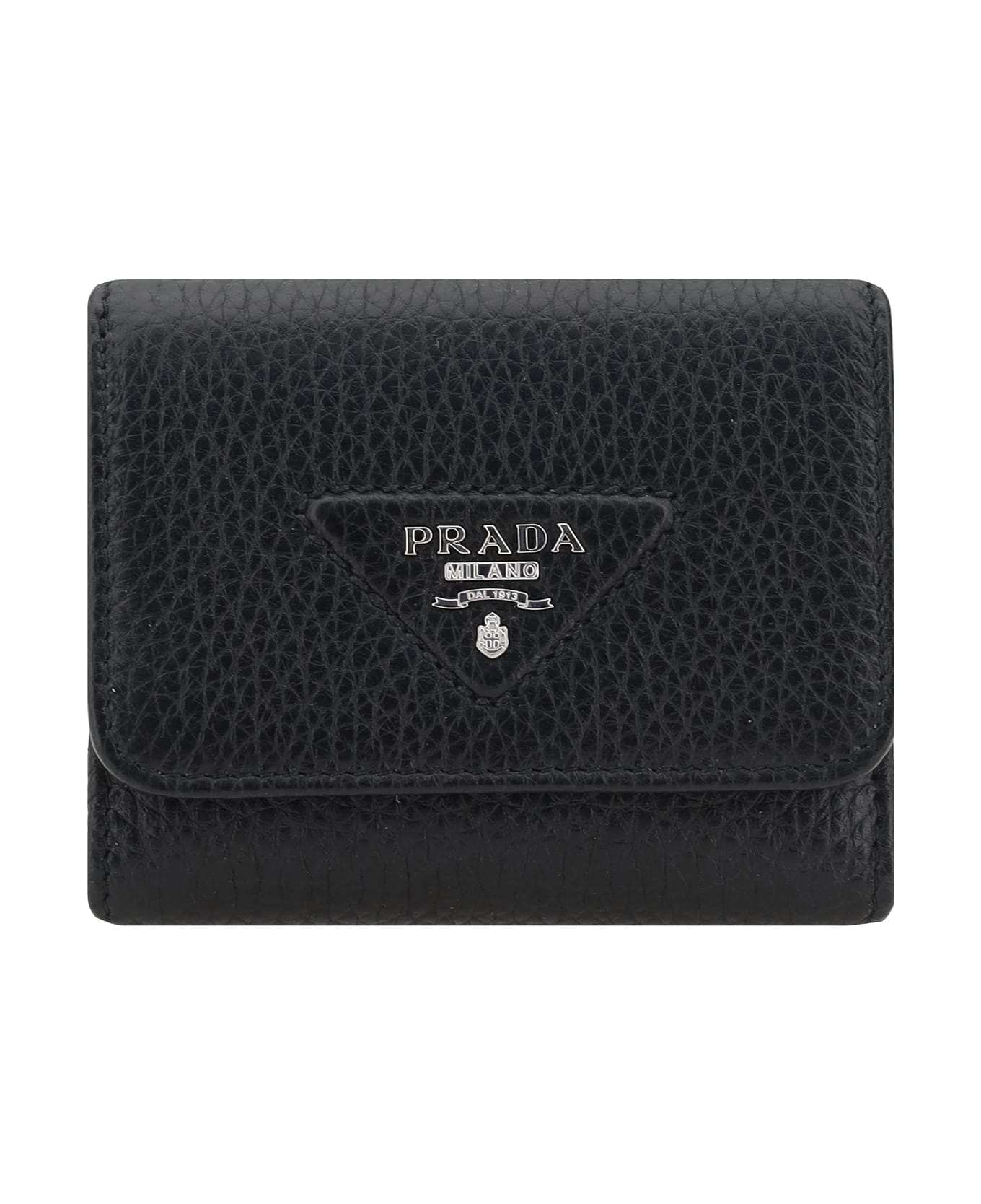 Prada's grained leather wallet is an elegant and practical accessory made of high-quality grained leather. the trifold design opens in three parts, providing optimal organization. the flap and snap-button closure on the front offers security, while the iconic applied monogram adds a distinctive and recognizable touch. inside, the wallet features a coin pocket with flap, card slots to keep cards tidy and a bill compartment. Composition: 100% % Calf Leather Bos Taurus