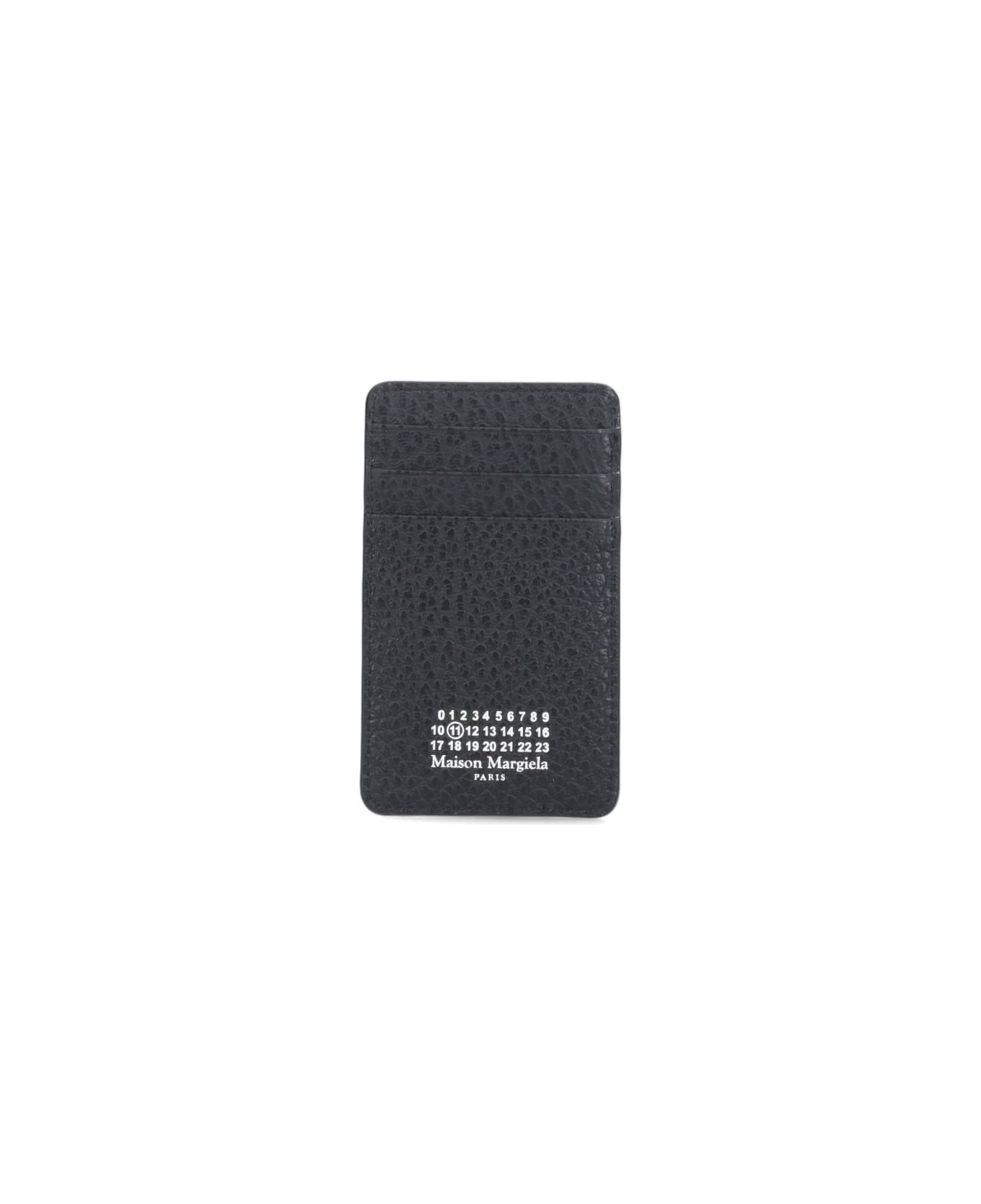 maison margiela vertical four stitches card holder in black hammered leather with one central flat pocket, three card slots on the front, bainco logo print on the front, three card slots on the back, and iconic white stitching on the back.