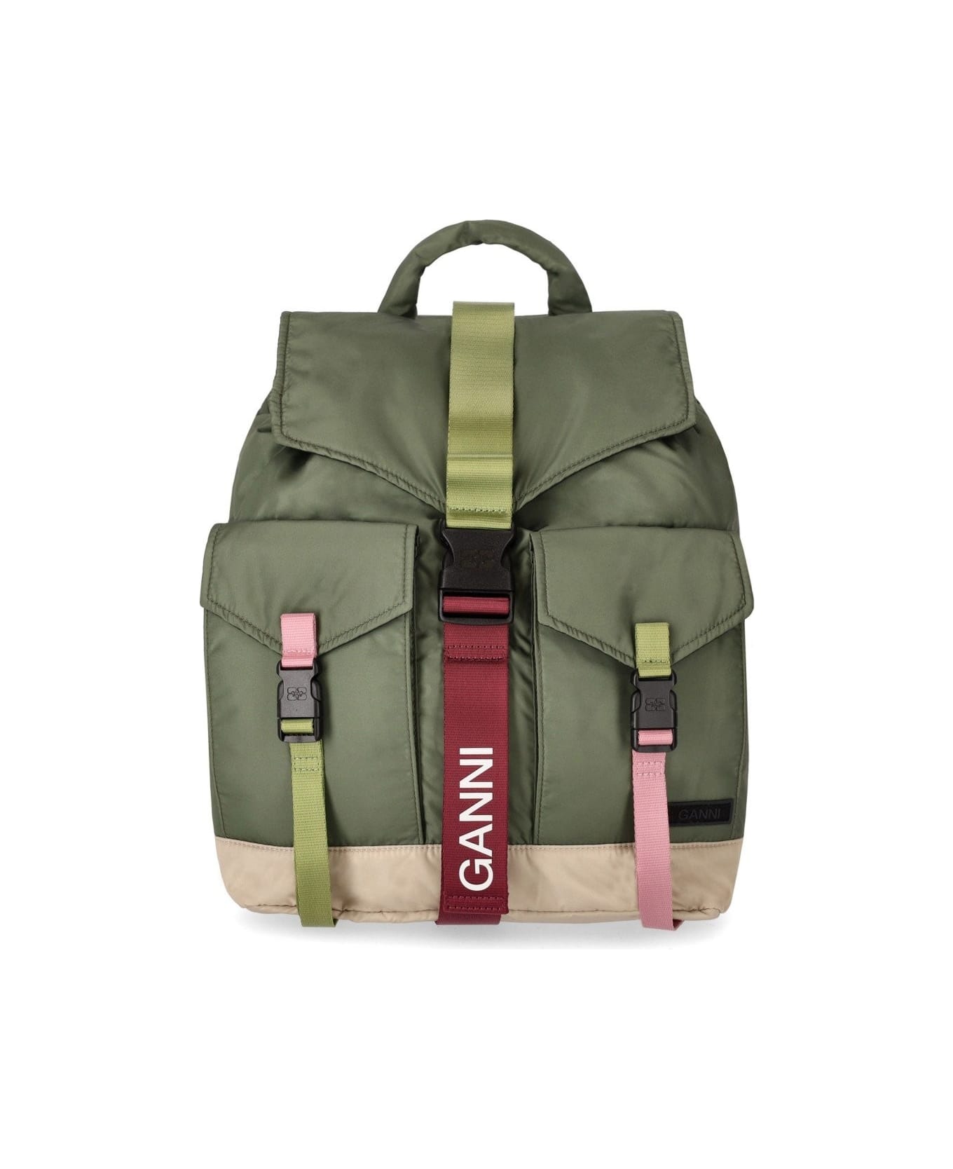 Ganni backpack made of military green recycled polyester, featuring an interior with slip pocket and drawstring, external pockets with flap, adjustable padded shoulder straps. Closure with contrasting color straps and buckles. GANNI logo printed on the central strap. Measurements 39x29x15. 5 cm. Composition: 100% recycled polyester.
