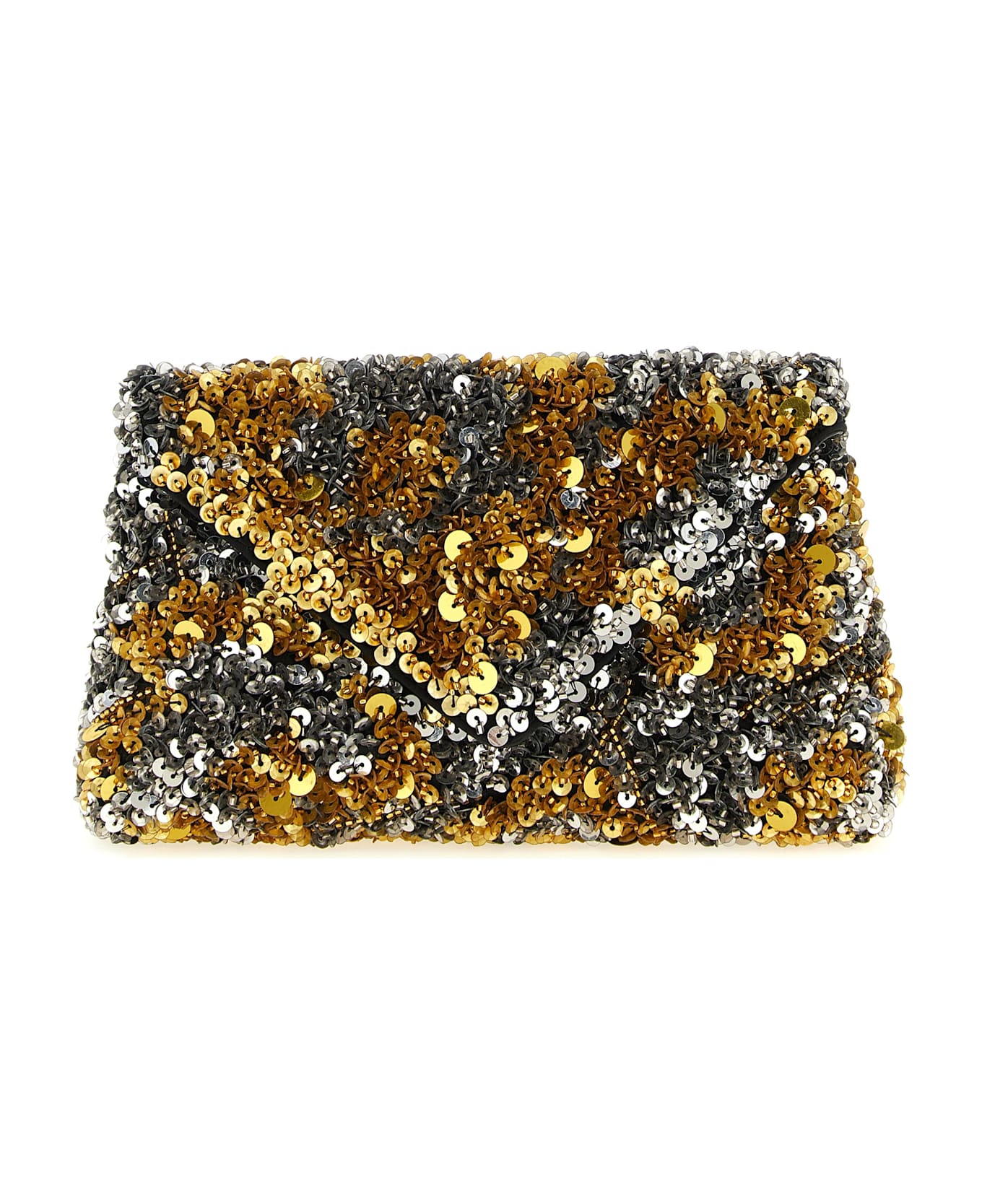 Embellished Envelope' silk blend clutch bag with all-over sequin embroidery, magnetic flap closure, leather lining, removable gold chain shoulder strap.