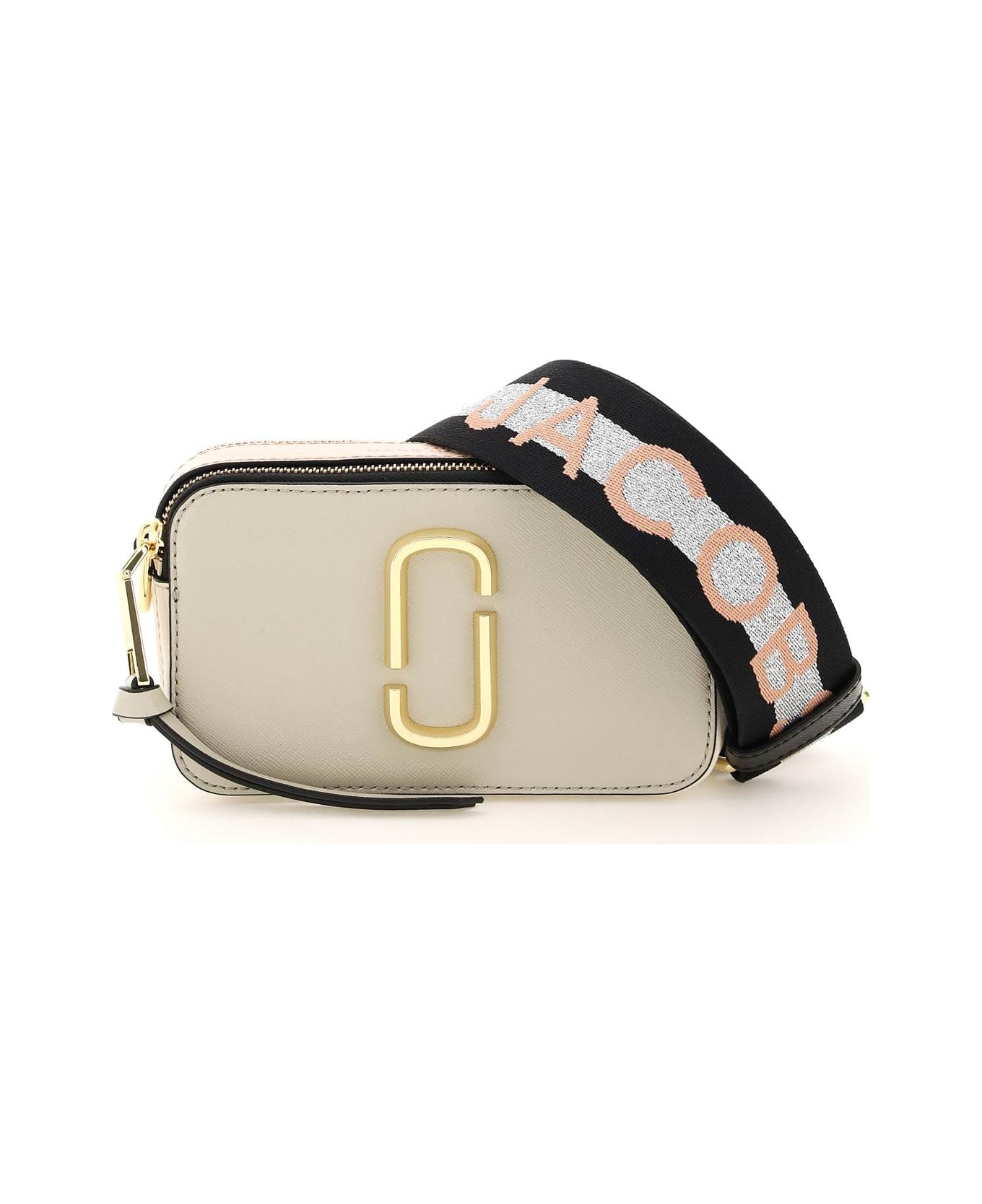The Snapshot small camera bag by Marc Jacobs in multi-tone saffiano leather with two independent zipped compartments and front metal Double-J monogram. Adjustable and removable jacquard striped webbing strap with central lurex stripe and contrasting logo over the whole length. Leather zip pullers, back flat pocket, logo embossed on the top. Fabric lining, one inner open pocket, gold-tone metalware.