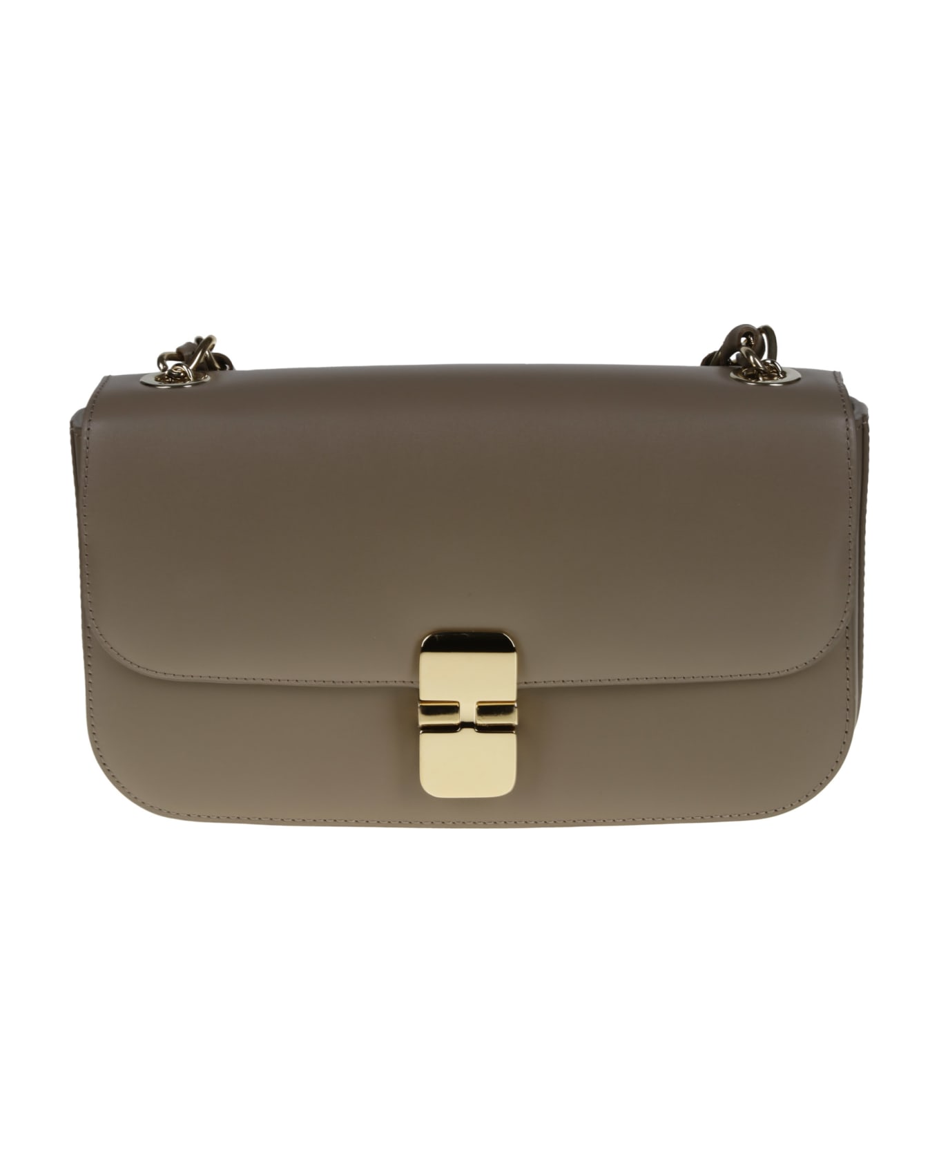 A. P. C. Beige leather bag, gold buckle, chain shoulder strap.