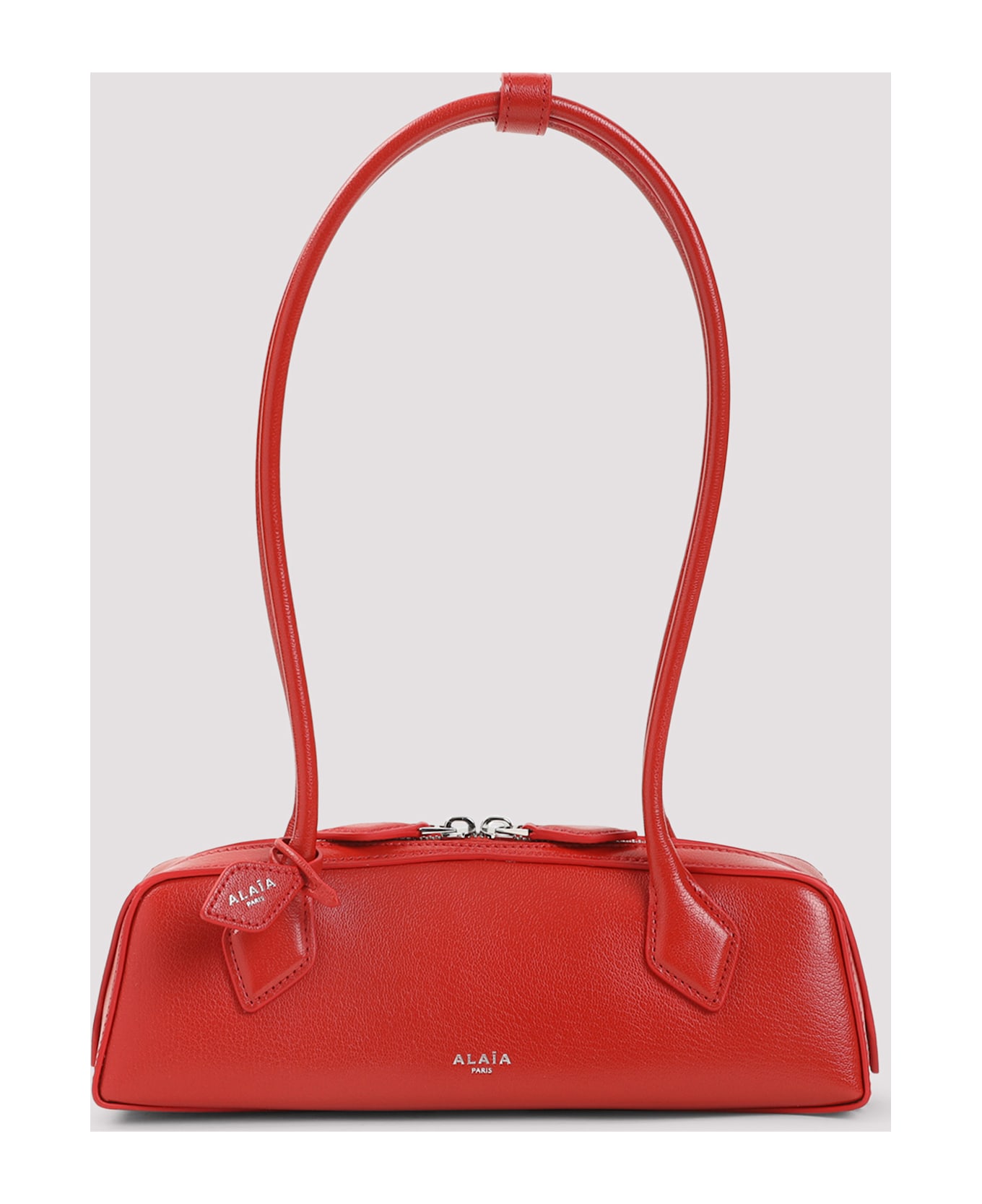 Alaïa Orange Brule Goat Leather Teckel Small Shoulder Bag. Pure Orange Brule goat leather bag, top handles, top two-ways zipped fastening, side tonal leather tag with silver tone lettering logo, front silver-tone lettering logo, one main compartment. Silver-tone hardware.