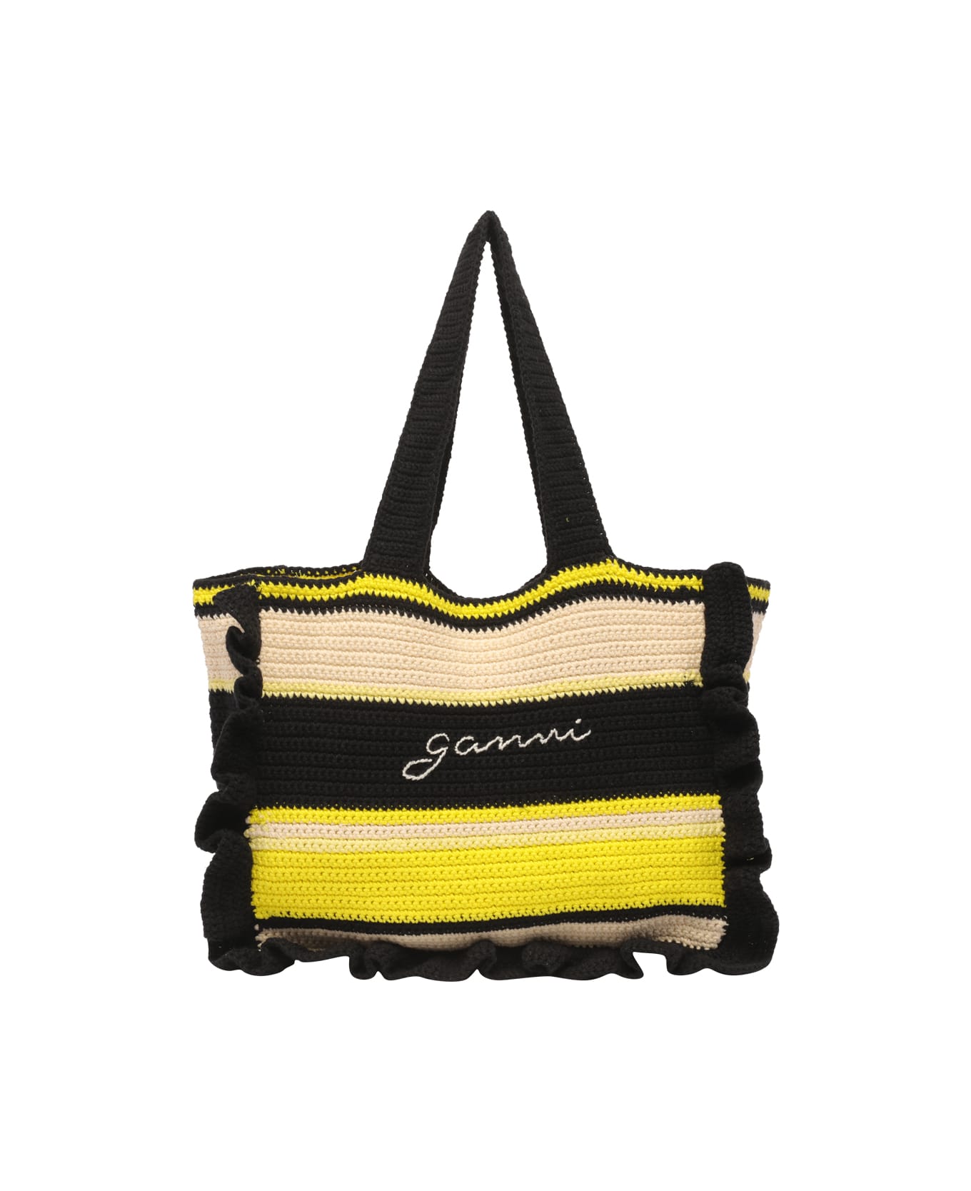 Ganni golden kiwi and black Crochet Frill tote, double handle and frontal logo Composition: 100% Cotton