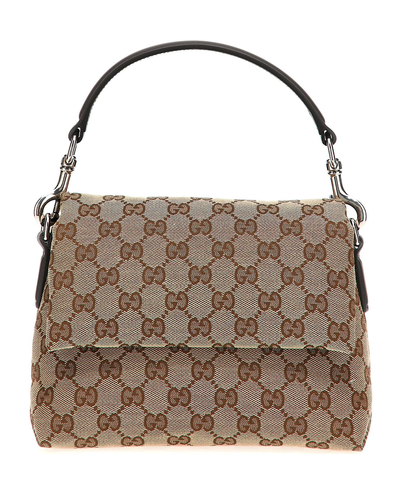 Small GG fabric shoulder strap with leather details, magnetic flap closure, leather back pocket with embossed embossed logo, removable leather handle, adjustable and removable web fabric shoulder strap.