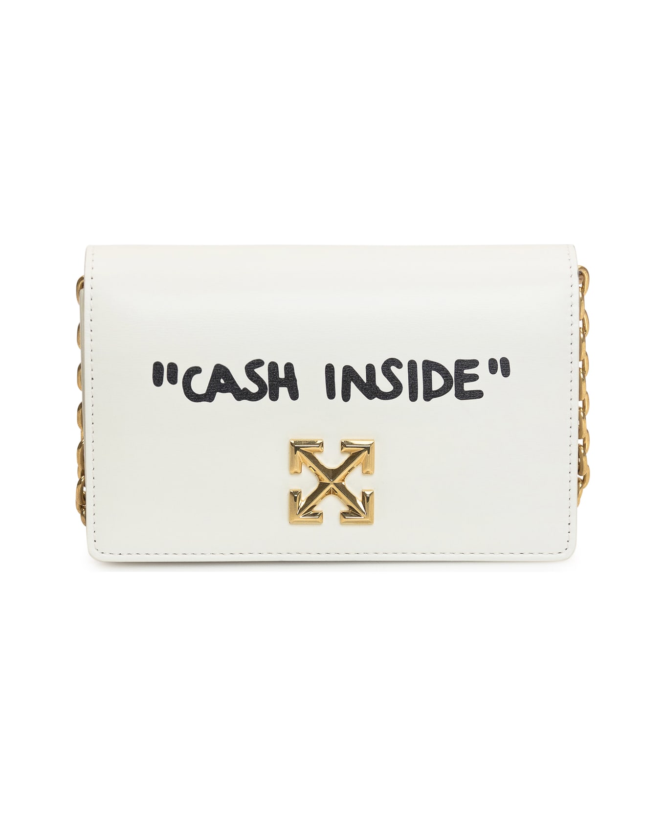 White shoulder bag. Chain strap. Closure with flap and button. Lettering on the front and back. Metal Arrow on the front.