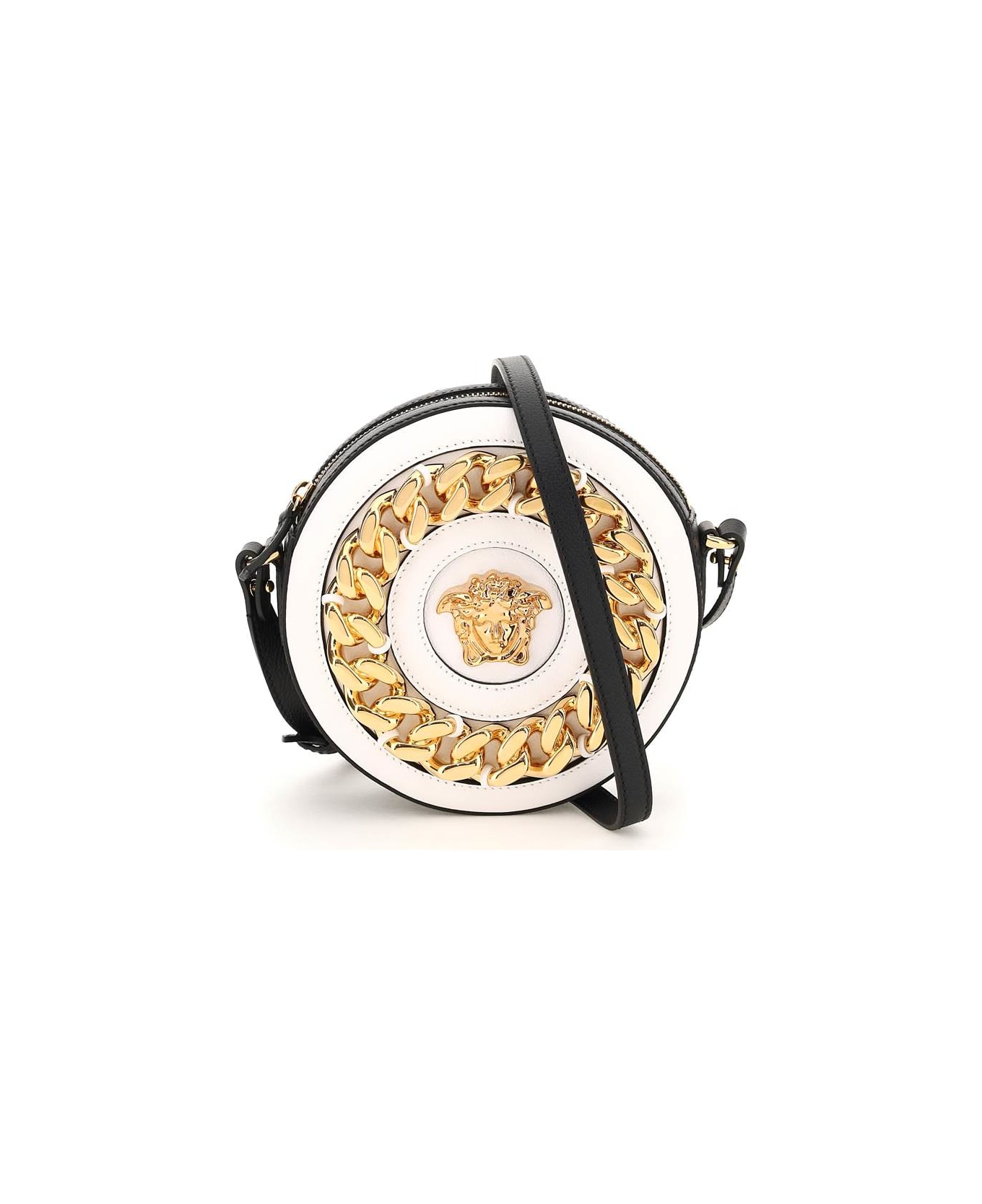 La Medusa round camera bag by Versace crafted in bicolour grained leather and enriched with the iconic three-dimensional Medusa and the oversized chain on front. Top zip closure and adjustable shoulder strap. Cotton-lined interior with one open flat pocket. Gold-finished metalware. Composition: 100% LH