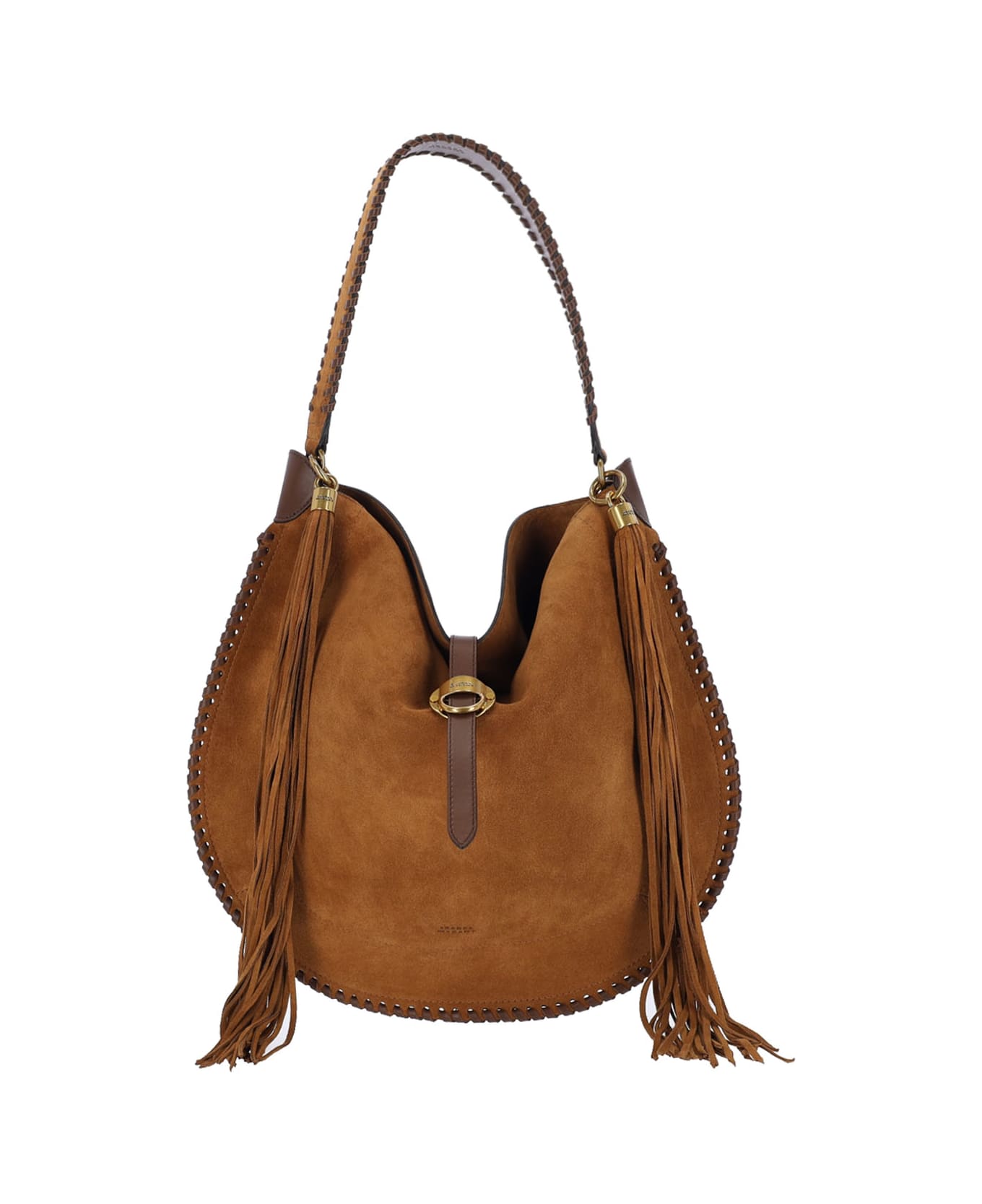 Isabel Marant 'Oksan Folk' bag in brown suede with top handle, strap closure, all-over woven detail, leather trims, tonal logo at the front, front fringe detail, removable zip pouch, main inner compartment. Composition: 100% Calf Leather