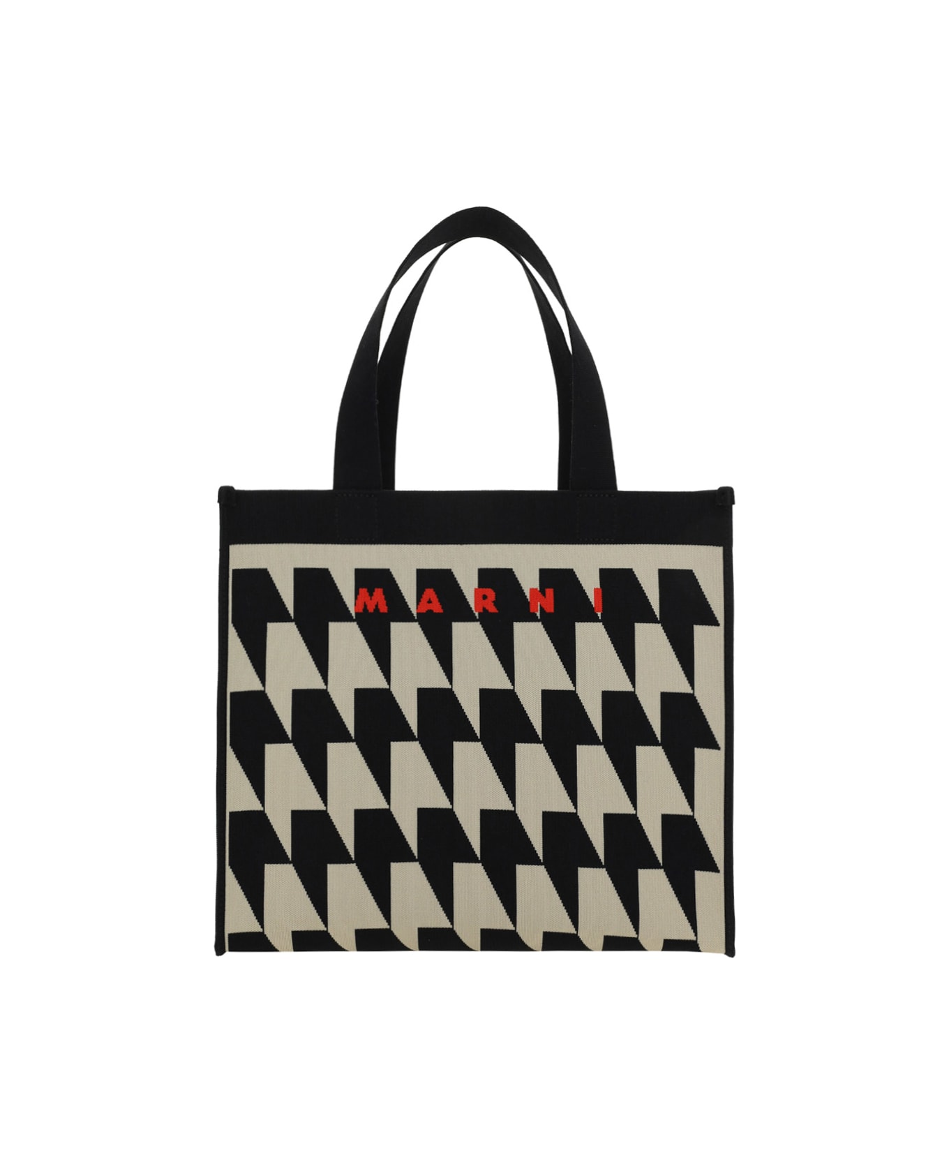 Shopping bag by marni, two semi-rigid handles in contrasting cotton, iconic brand monogram on front, top hook closure, interior welt pocket with zipper for closure, removable interior pouch, multicolored pouch with zipper for closure and iconic brand signature patch on front.