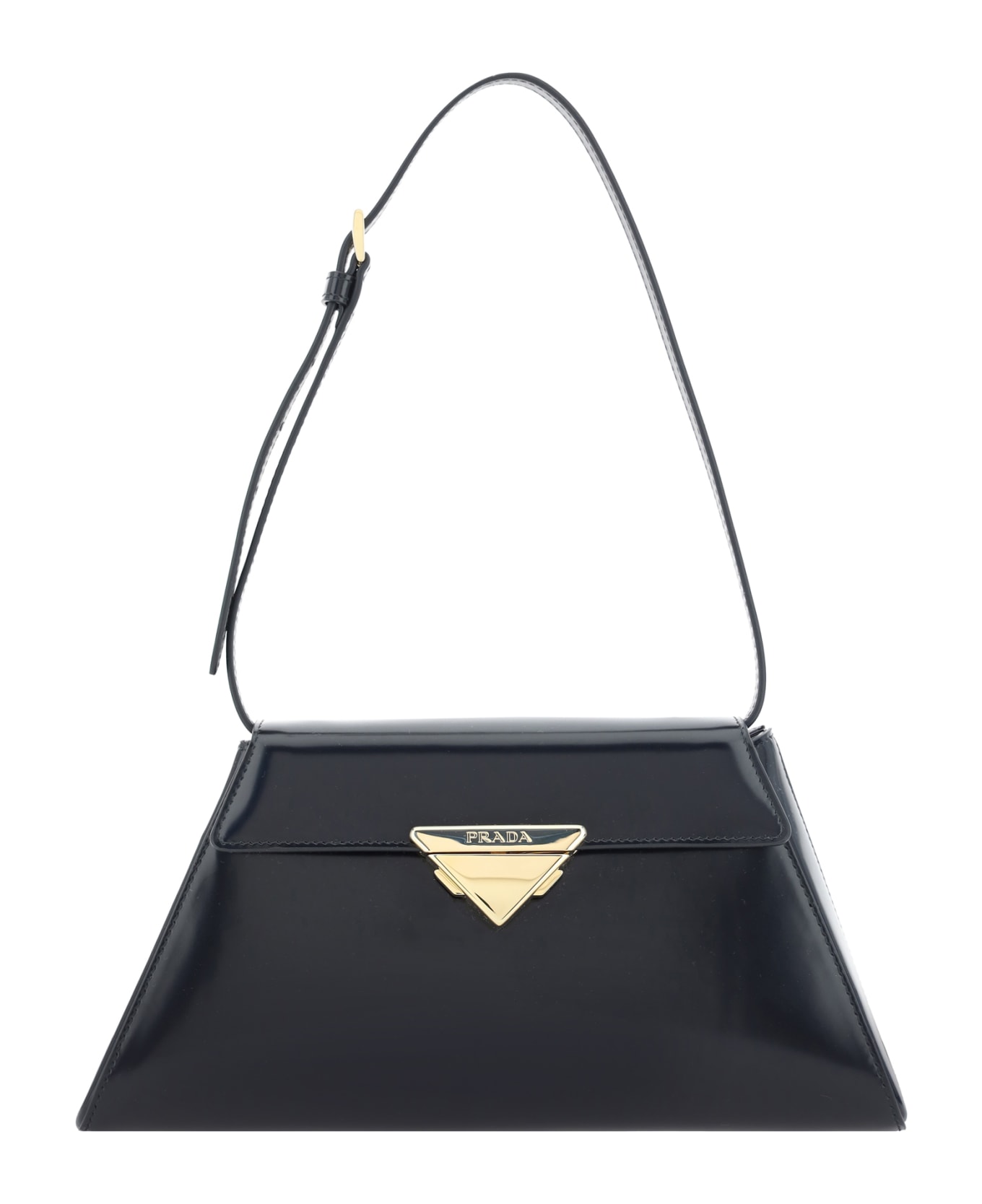 Calfskin shoulder bag by prada, geometric trapeze design, made of patent leather, front closure by triangular-shaped metal clip, adjustable flat shoulder strap, single interior compartment. Composition: 100% % Calf Leather Bos Taurus