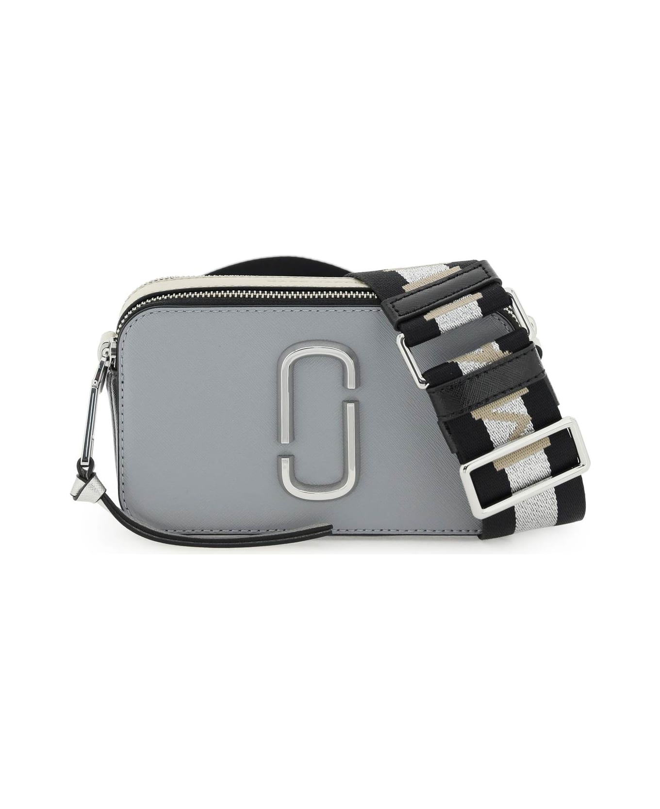 The Snapshot small camera bag by Marc Jacobs in multi-tone saffiano leather with two independent zipped compartments and front metal Double-J monogram. Adjustable and removable jacquard striped webbing strap with central lurex stripe and contrasting logo over the whole length. Leather zip pullers, back flat pocket, debossed logo on the top. Fabric lining, one inner open pocket, gold-tone metalware.
