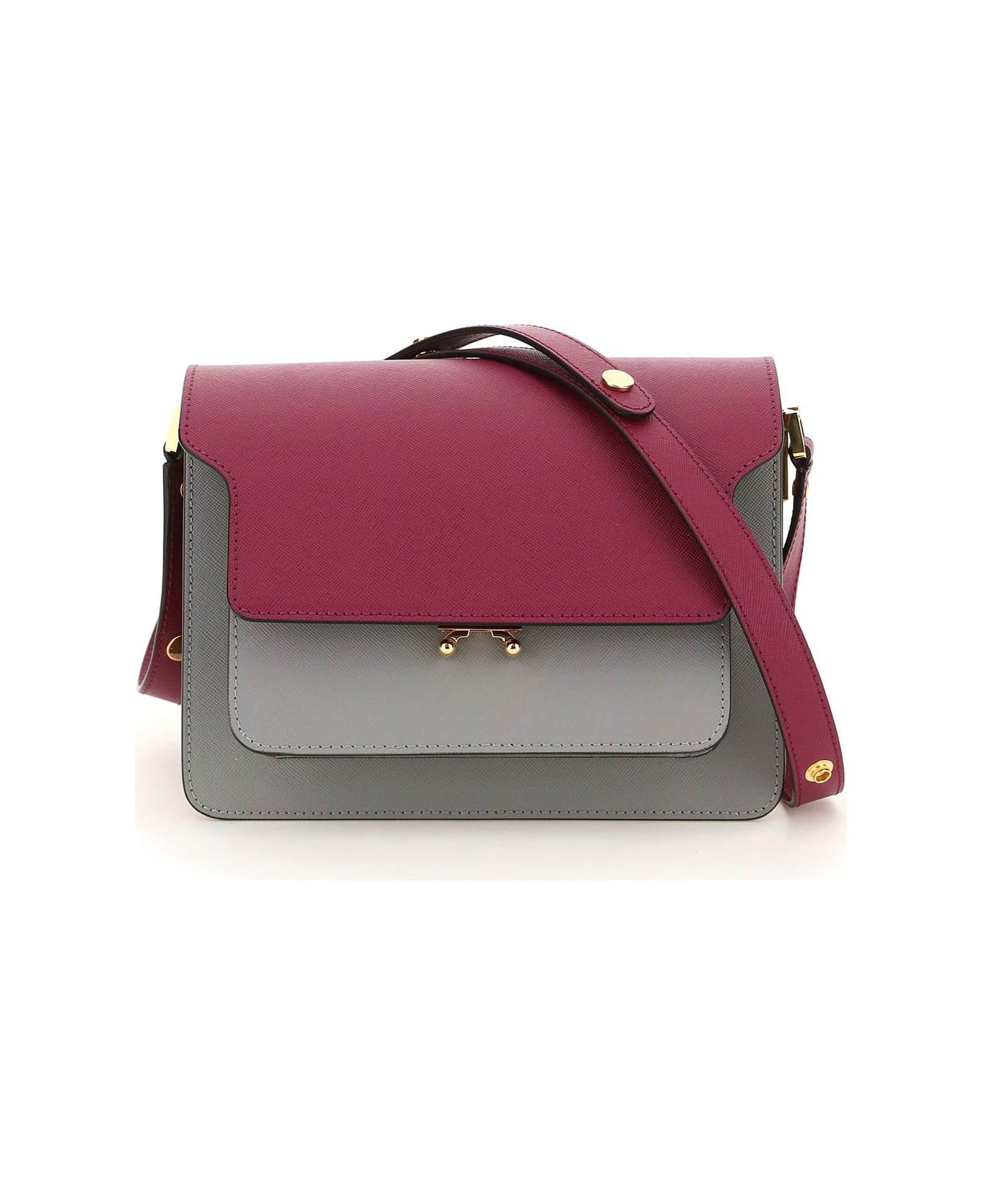 Marni Trunk medium bag in tricolour saffiano leather with adjustable shoulder strap with extra insert and flap with snap closure. Side metal details with engraved logo ,back slit pocket, four gusset compartments, two inside zip pockets and fabric lining. Gold-tone metal hardware. Composition: 100% vitello
