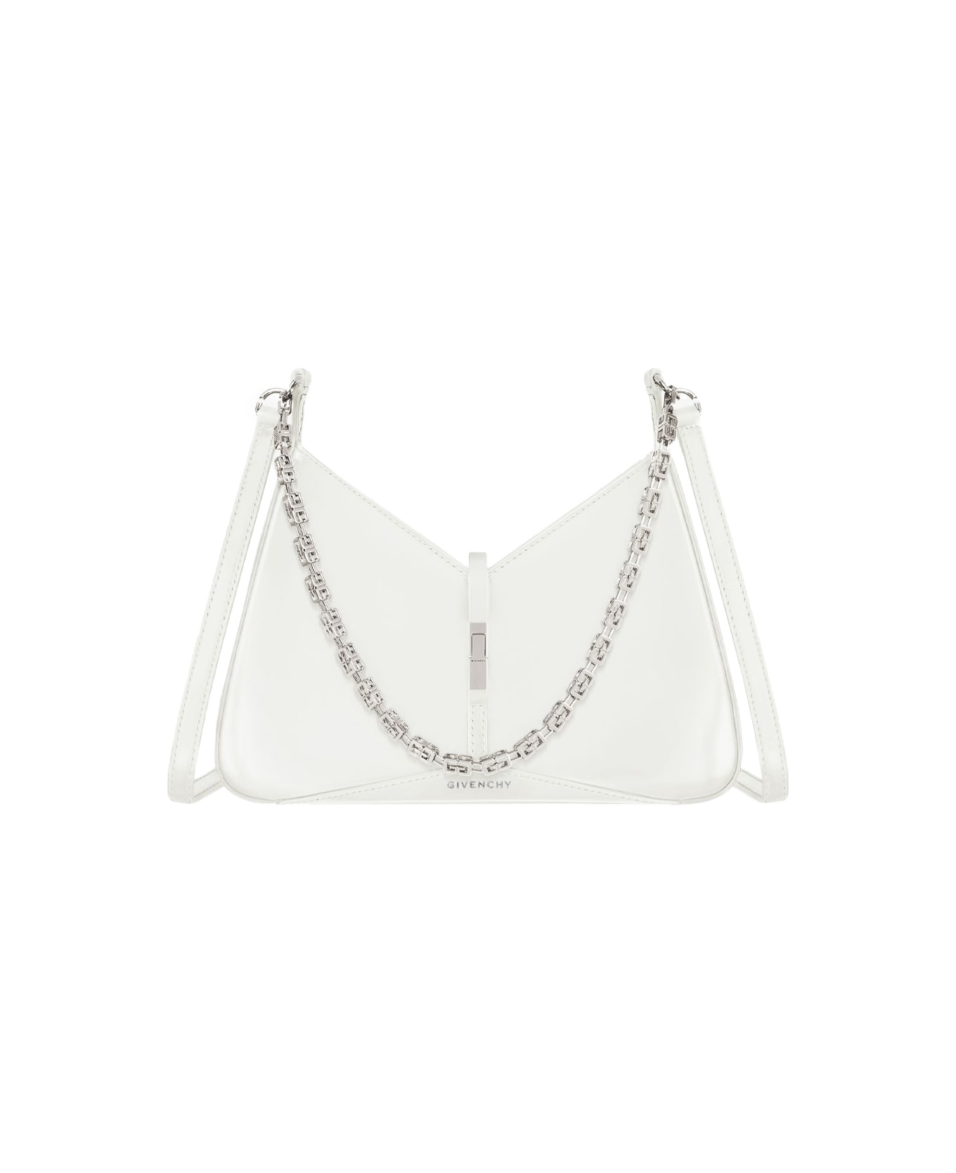 Small Cut Out bag by GIVENCHY made from ivory brushed glossy calf leather. Model features V-cut, canvas lining, silver-tone metal details, one main zippered compartment, GIVENCHY metal buckle closure, G Cube chain at front for hand or shoulder carry. Adjustable thin leather shoulder strap for hand, shoulder and short shoulder carry. Adjustable shoulder strap length from 39 to 47 cm.