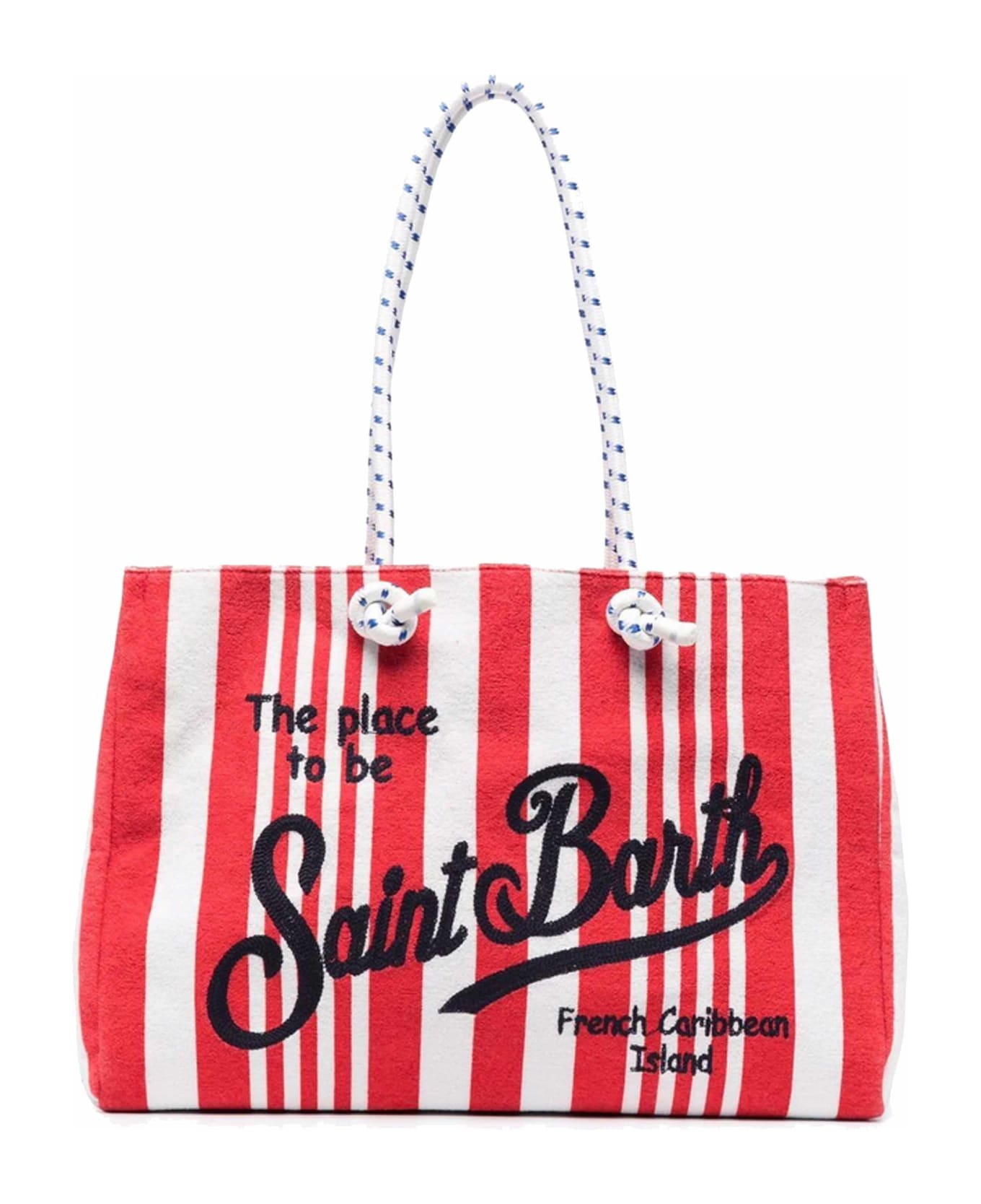 The sponge bag for your free time, red vertical stripe on background white , blue Saint Barth embroidered , inside pocket with zip, rope handles. Sizes: L 45 cm x W 35 cm x H 14 cm.