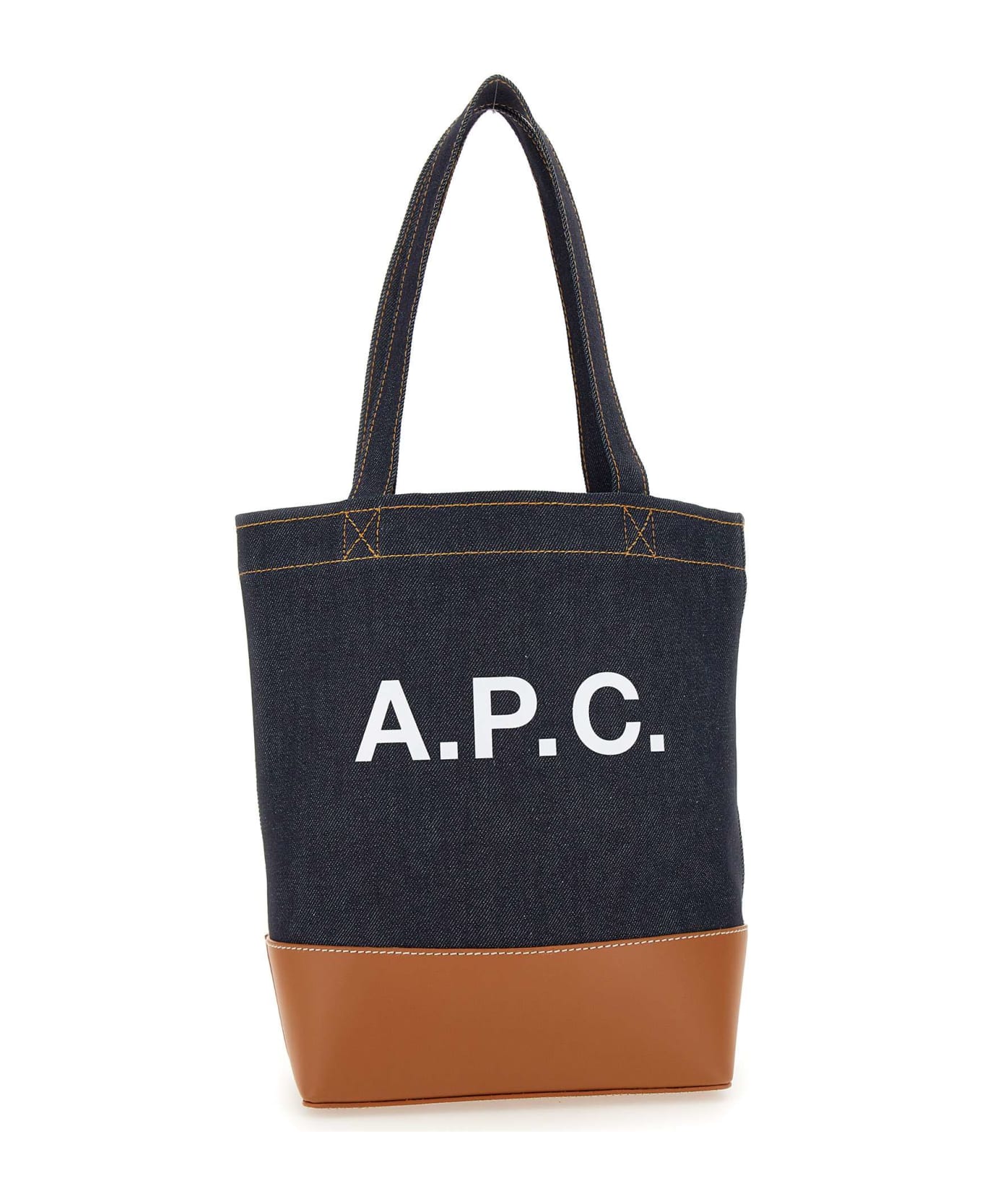 A. P. C. shoulder bag "Axel Tote Small" denim fabric, navy blue with smooth caramel leather base, double top handle, silver metal, unlined interior with zipper pocket, contrasting white logo printed on front. Dimensions: length 21cm, height 29cm, depth 10cm.