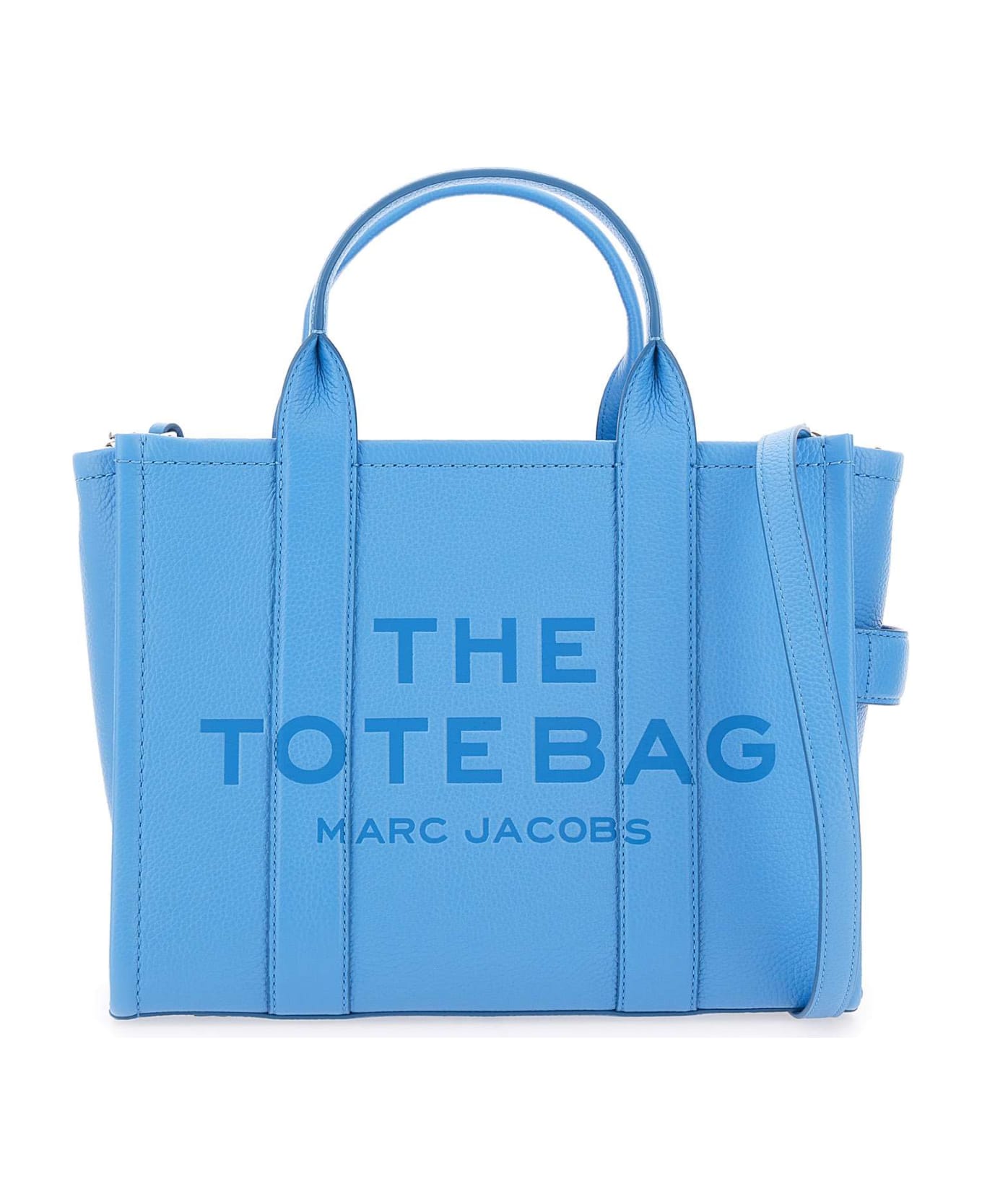 Marc Jacobs "The Tote Medium" full grain leather handbag, cyan blue, top fastening with zip, double top handle, removable and adjustable leather shoulder strap,one internal zip pocket, two slip pockets, one card slot, front embossed logo, silver hardware, back logo patch, dustbag included. Dimensions: length 32cm height 25cm, depth 13cm. Shoulder strap 100cm.