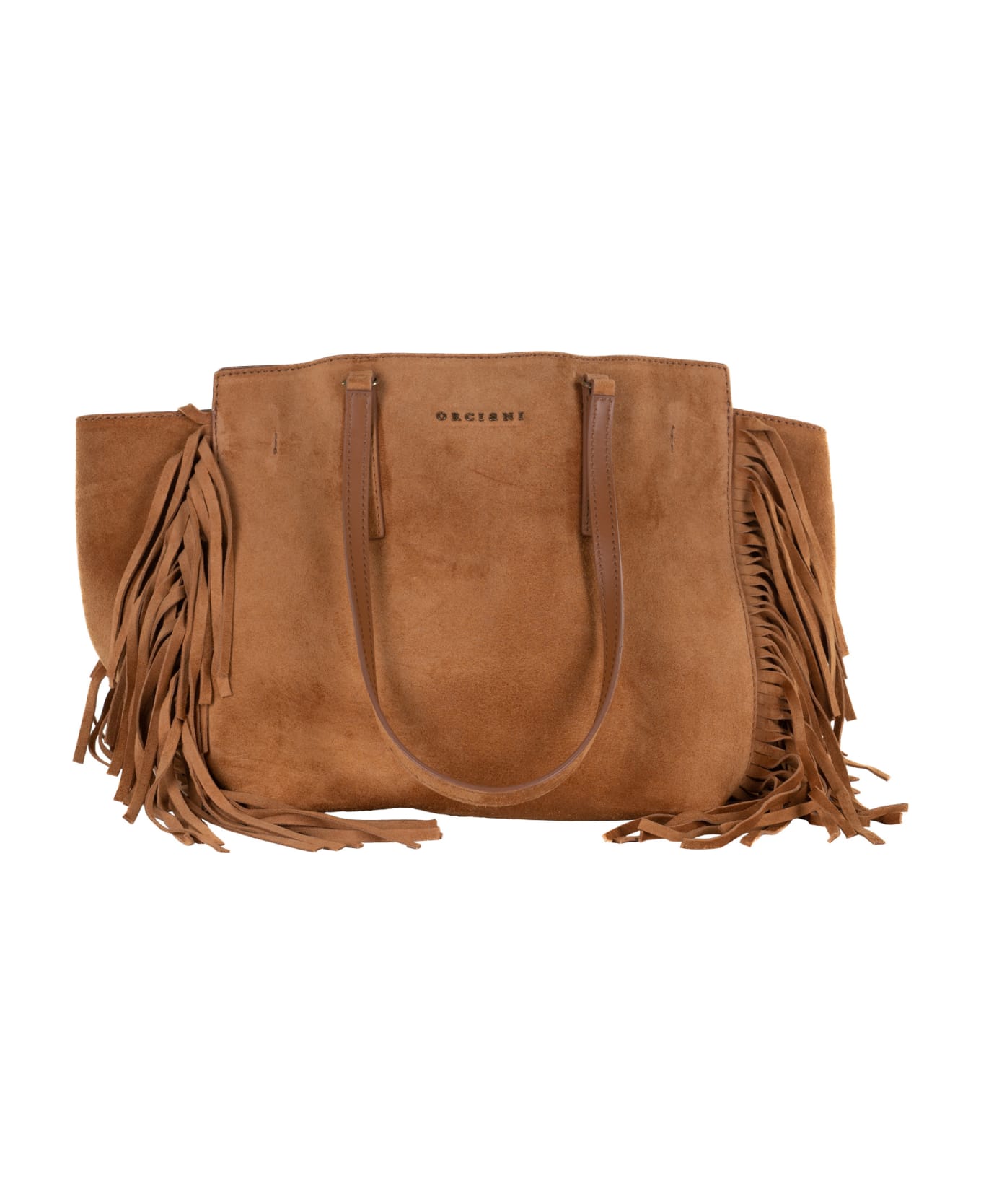 Brown suede tote bag with fringesfrom Orciani. - composition: 100% leather - made in italy - measures: 44 x 25 x 23