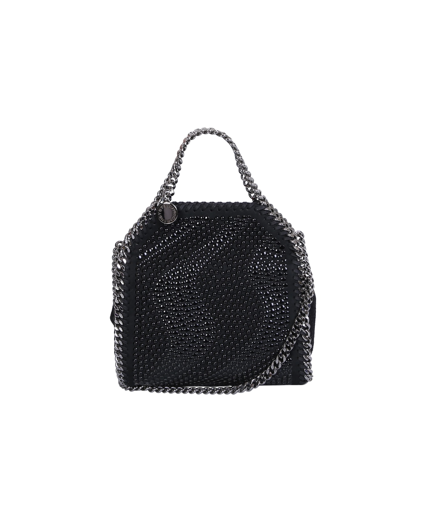 Magnetic fastening. Main compartment. Internal slip pocket. Two chain link top handle. Chain link shoulder strap. Logo charm. Signature diamond-cut chain link trim. Stud embellishment. Silver tone hardware. Color: black