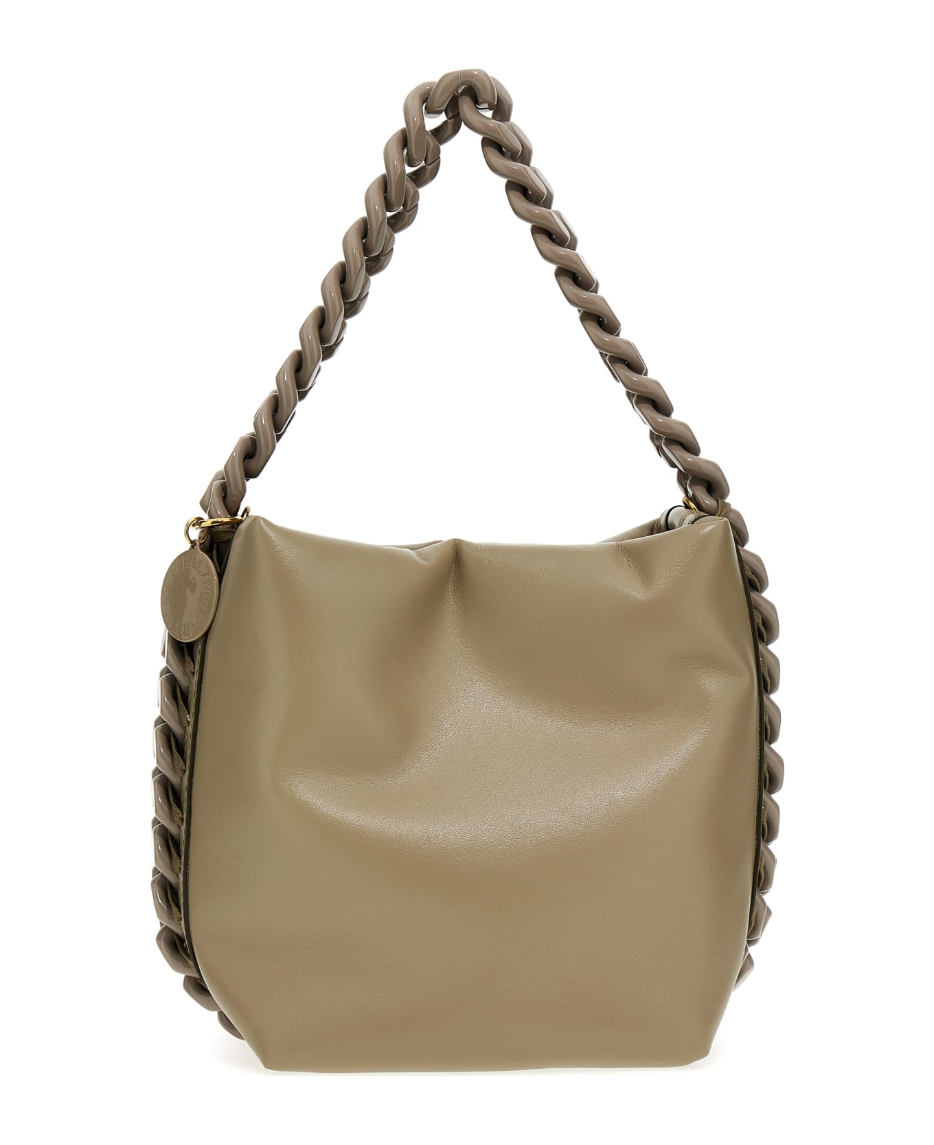 Frayme' alter mat puffy bucket bag with removable shoulder strap and chain shoulder strap for hand use, charm with logo. Composition: 65% polyester 35% polyurethane