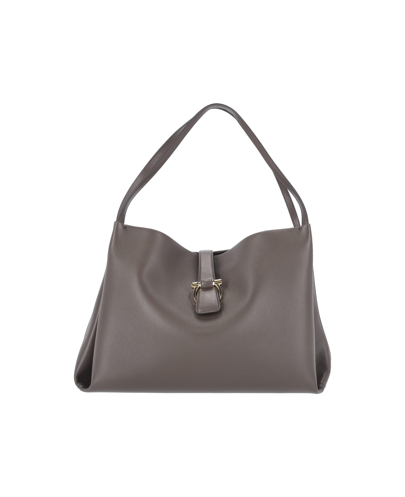 Ferragamo 'Gancini' large tote bag in grey calf leather, two top handles, silver metal 'gancini' closure on the front, inner zip pocket, single main inner compartment. Composition: 100% Calf Leather