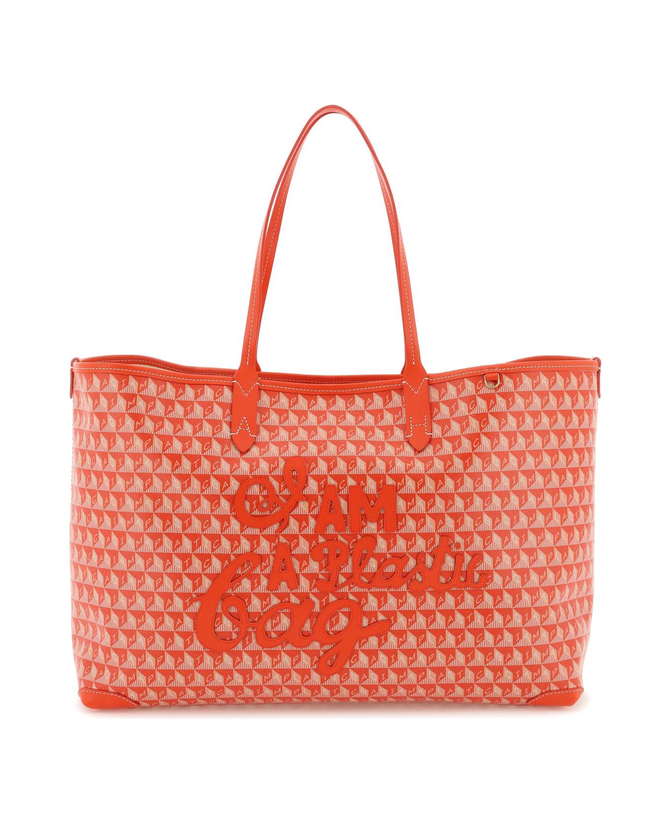 Tote bag by Anya Hindmarch in recycled canvas characterized by the faux leather lettering applied on the front and "I am a plastic bag" print on the entire surface. Double handle, faux leather corners at the base and trims, bridge closure with knotted laces, unlined interior with a zip pocket and three credit cards pockets with logo and the iconic gold-tone metal bow.