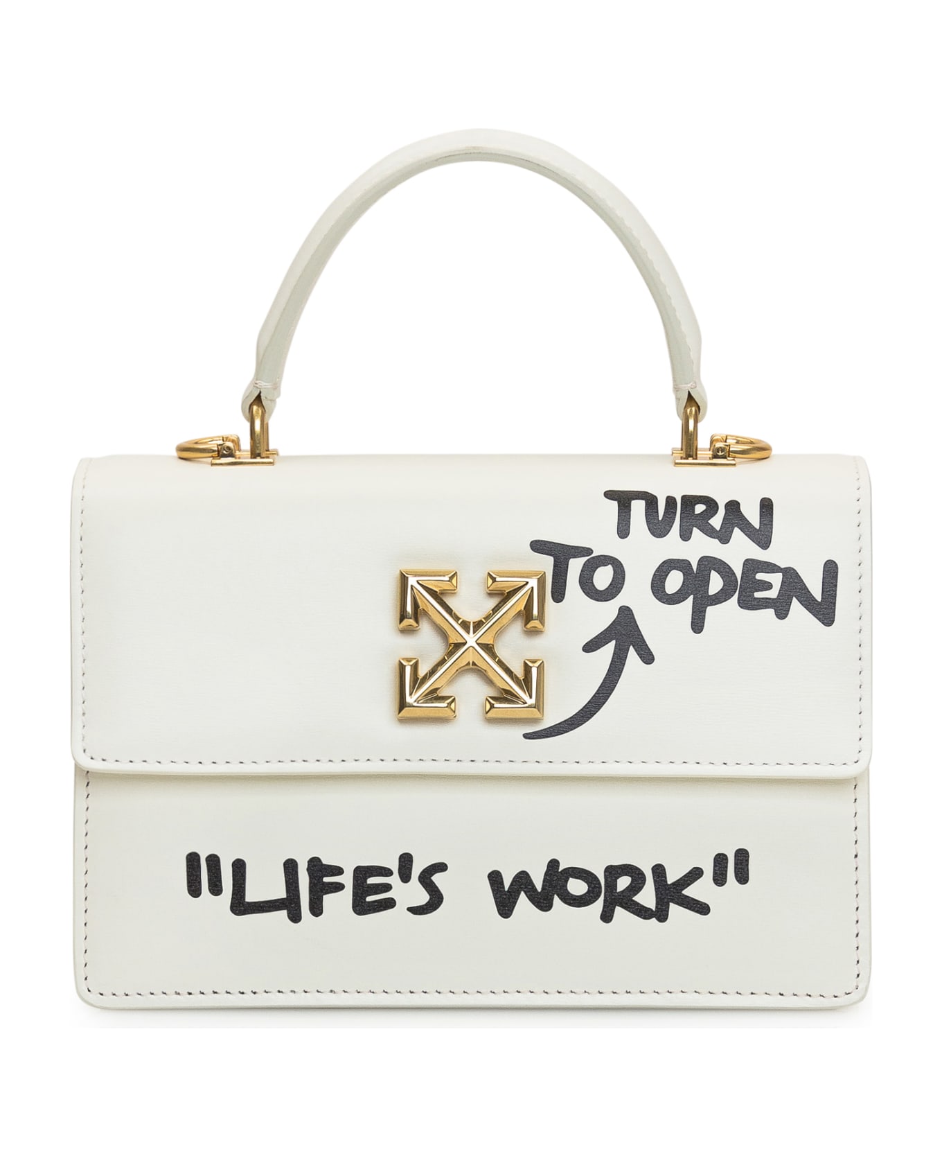 White bag. One handle. Adjustable and removable shoulder strap. Closure with flap and joint. Lettering on the front and back. Metal Arrow on the front.