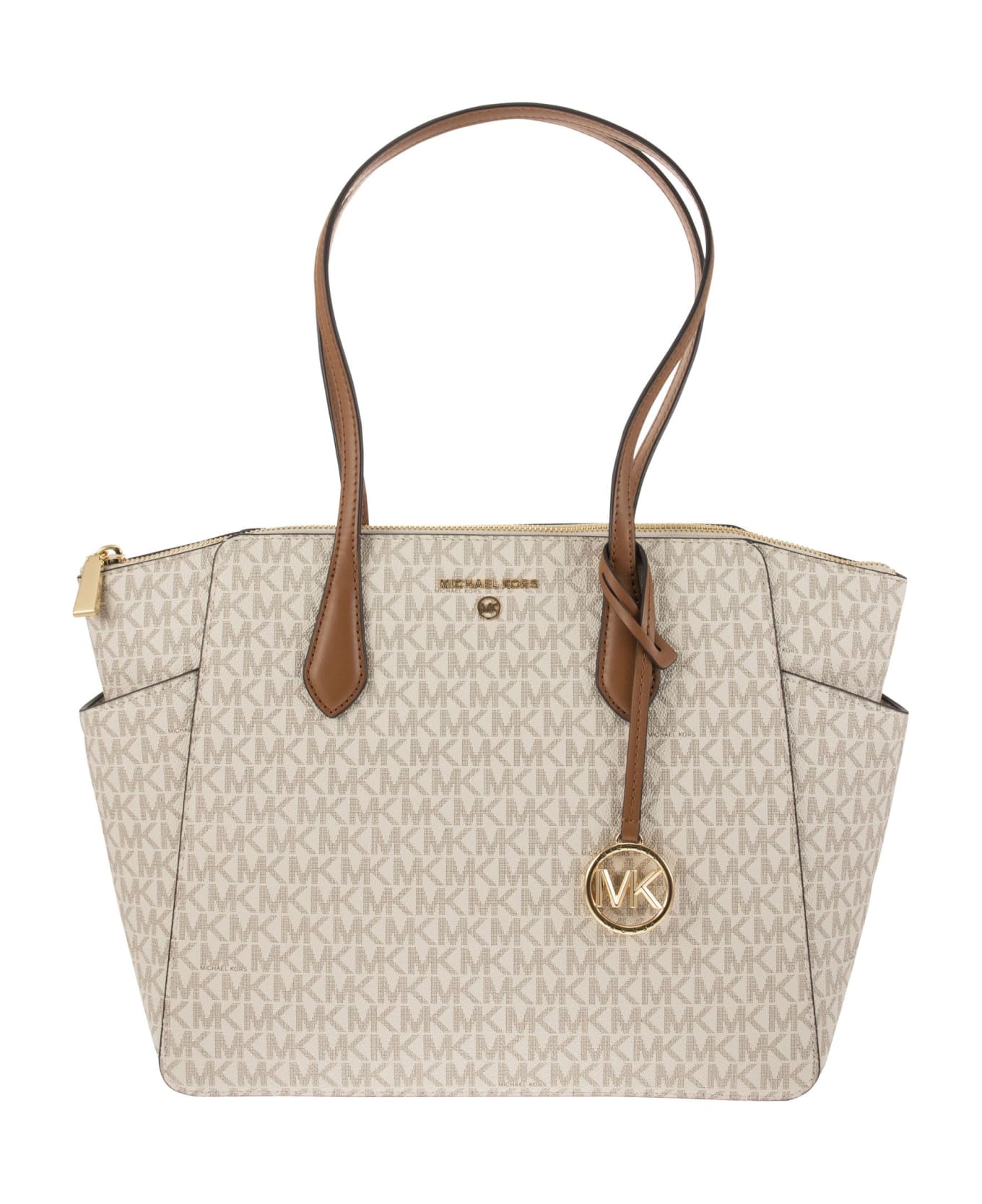The Marilyn tote bag is an essential everyday accessory. The iconic "MK" initials lend an unmistakable charm to this structured design, while the capacious interior features pockets for everyday items. The slim handles make it ideal for comfortable shoulder wear on busy days. - Gold-tone metal details - External details: 2 side pouch pockets - Interior details: back zip pocket, 2 front slip pockets - Zip closure DESIGNER ID: 30S2G6AT2B 149