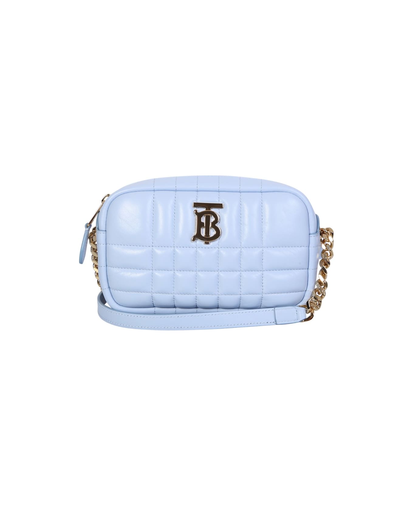 Quilted. Logo plaque. Top zip fastening. Main compartment. Leather and chain-link shoulder strap. Color: light blue