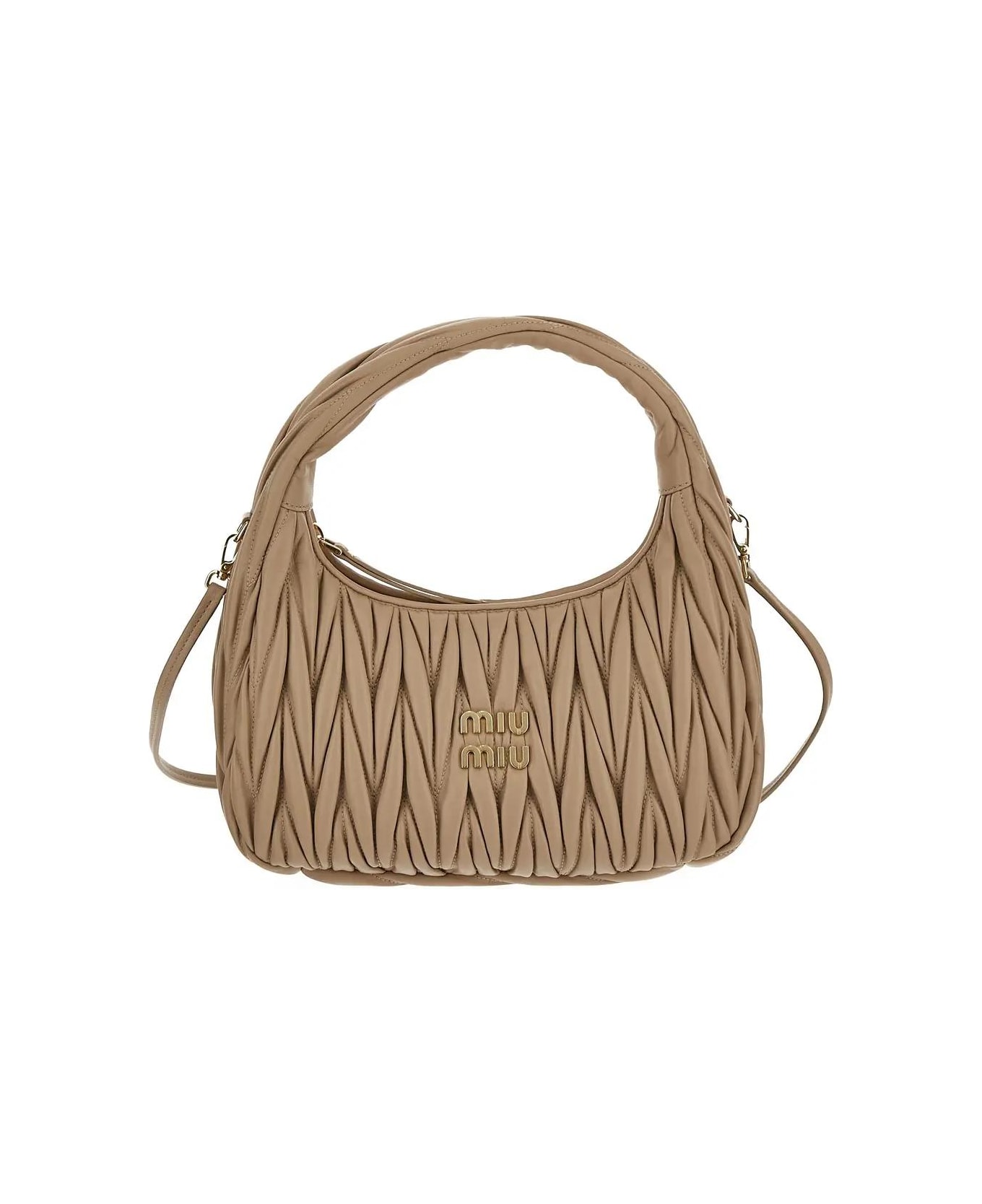 Miu Miu bag in beige leather with top handle. The item is featured by zip fastening, shoulder strap and gold-tone hardware. Composition: 100% Leather