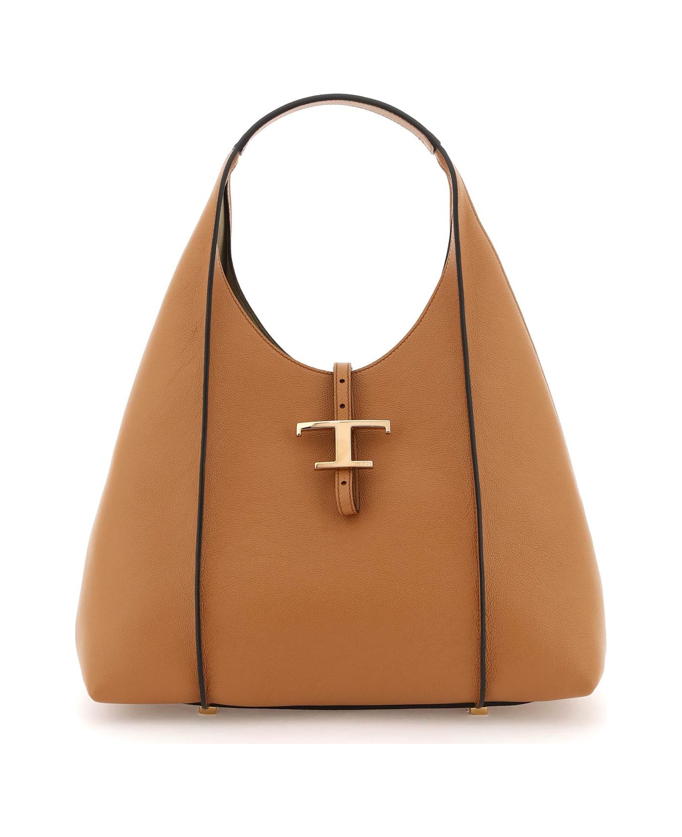 Tod's medium shopping bag in grained leather, characterized by the pendant metal T Timeless detail with engraved lettering logo. Suede microfiber lining. Equipped with an inner extractable pouch in grained leather with front debossed logo and zip closure. Gold-finished metalware and protective studs.