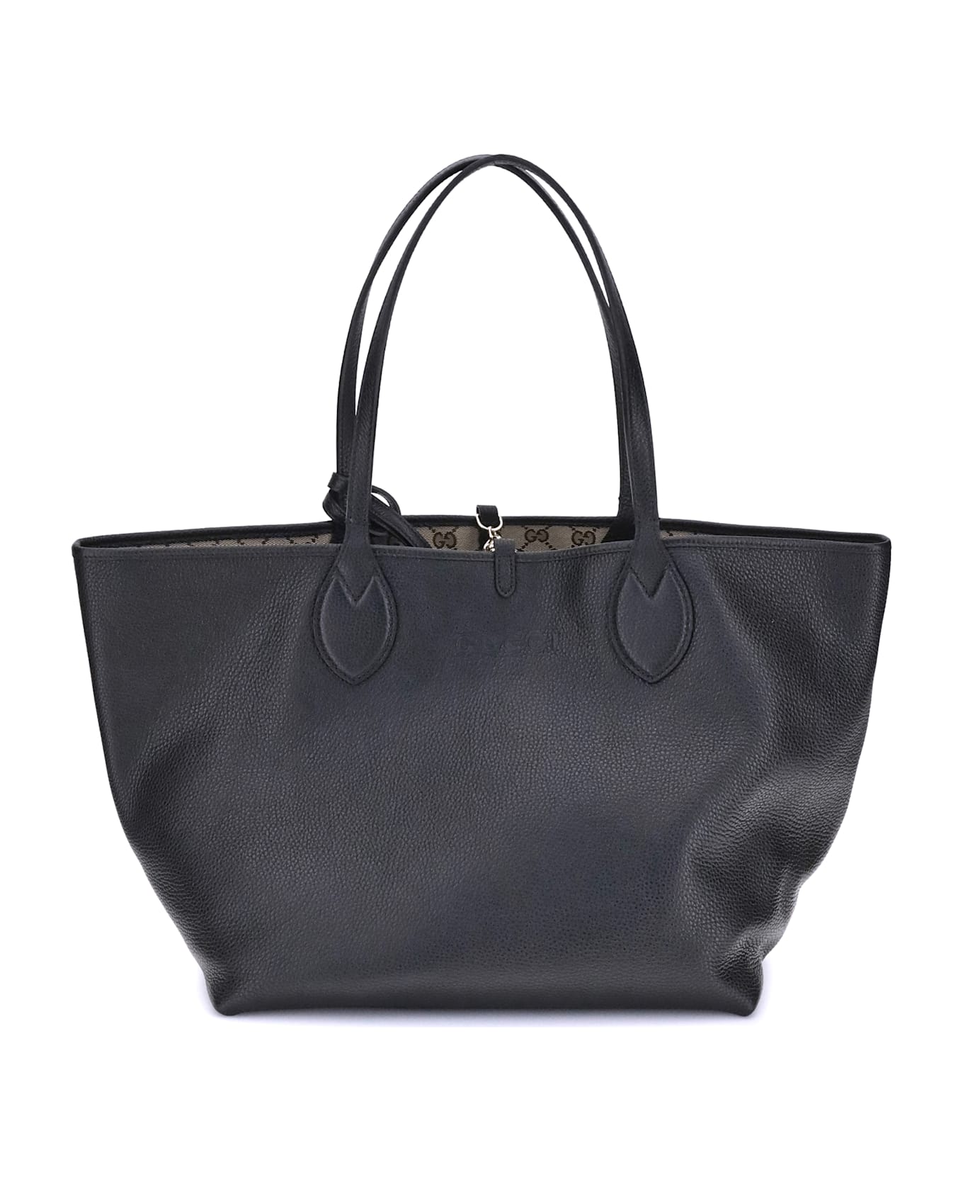 Gucci's reversible totissima tote bag is an iconic accessory that combines versatility and luxury. extremely functional, it stands out for its ability to be worn two ways: one side features elegant black grained leather, while the other reveals timeless gg fabric in shades of beige and dark brown, allowing for an instant change of style. light gold-colored trim adds a touch of refined shine. featuring a practical internal pouch for better organization and two convenient handles, it closes with a discreet hook, making it the ideal companion for any occasion, from day to evening.