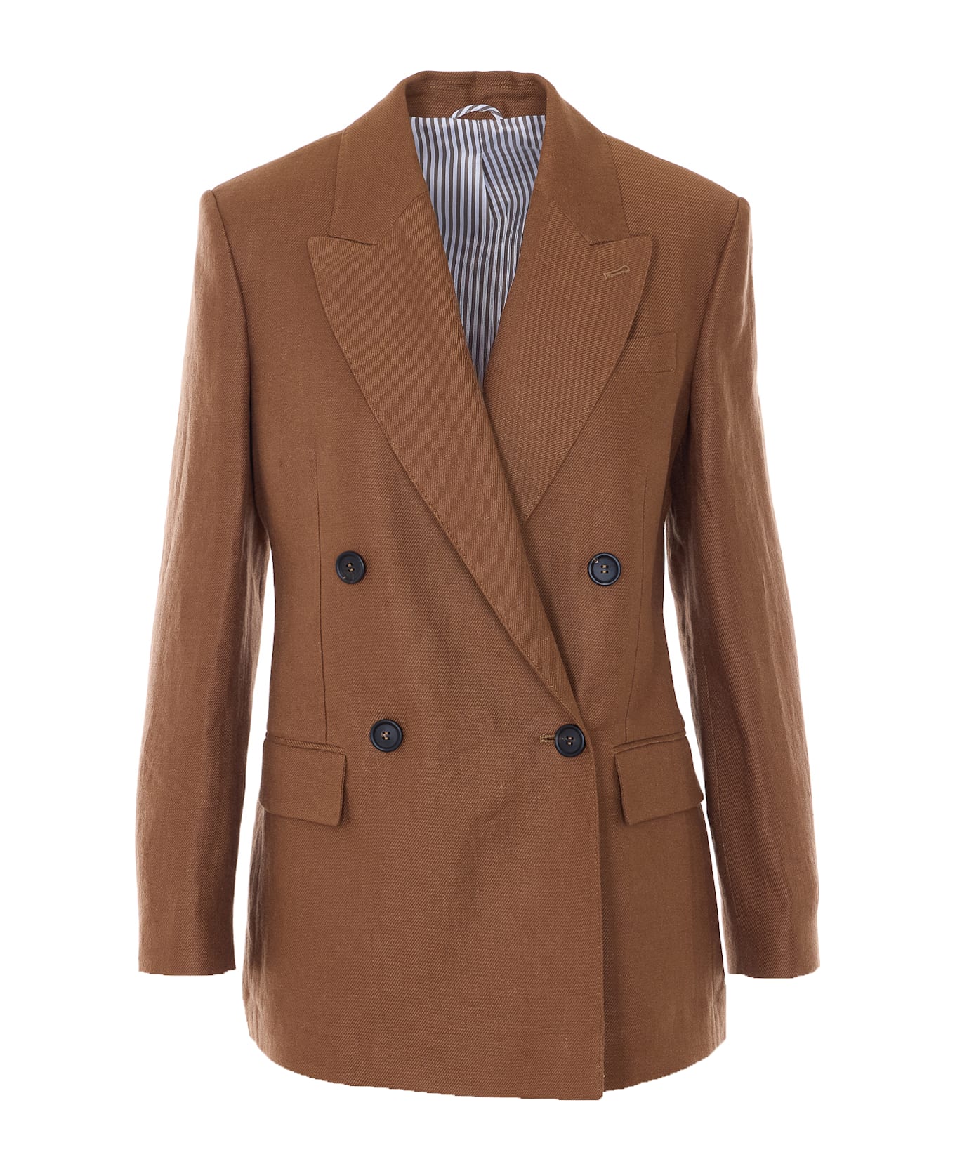 Brunello Cucinelli brown jacket with frontal double breasted buttons closure, V-neck, long sleeves, reinforced shoulder, buttons on cuffs Composition: 100% Linen, 84% Viscose, 16% Silk