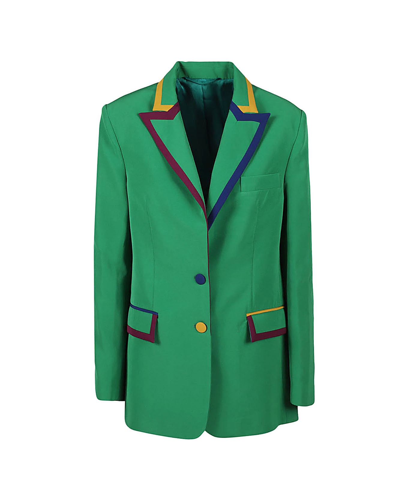 contrast-trim single-breasted blazer from alessandro enriquez featuring bright green, contrasting trim, peak lapels, front button fastening, long sleeves, buttoned cuffs, chest welt pocket, two front flap pockets, central rear vent and straight hem.