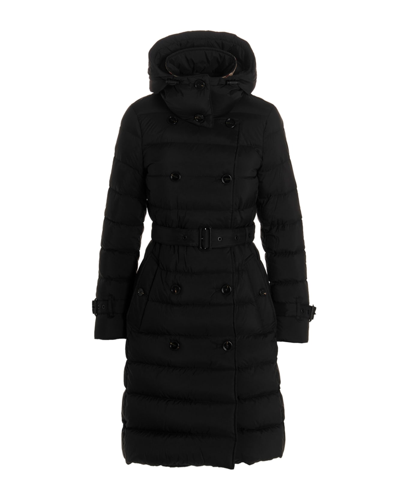 Double-breasted 'Ashwick' feather padded down jacket with removable hood with drawstring, Vintage check undercollar and strap cuffs, button welt pockets, and collar with hook closure. Length: 97 cm Composition: 100% nylon