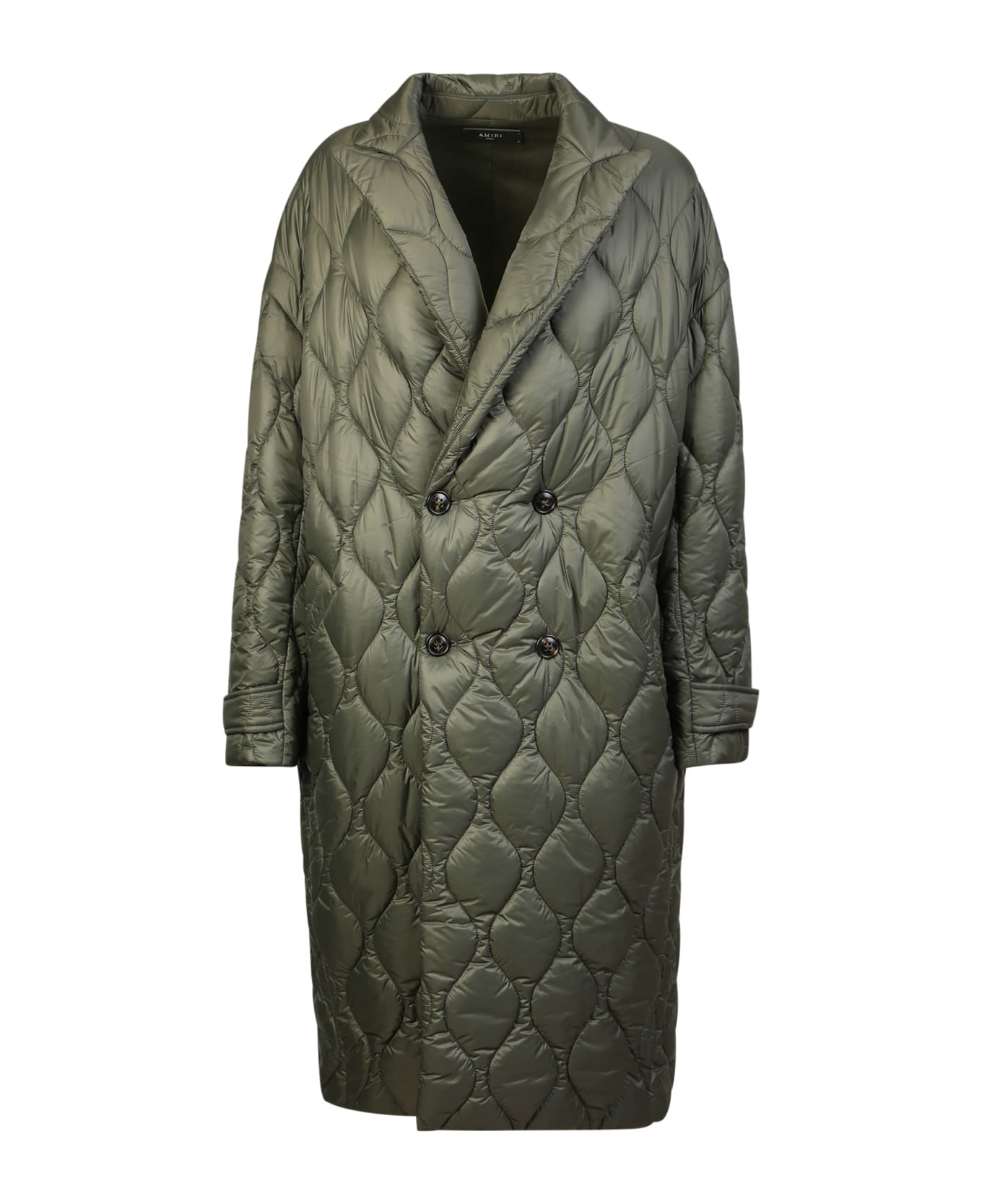 Long oversized coat. Quilted. Classic colla. Peaked lapels. Double Breasted. Front button fastening. Two side slit pockets. Slit on the rear. Colore: olive green