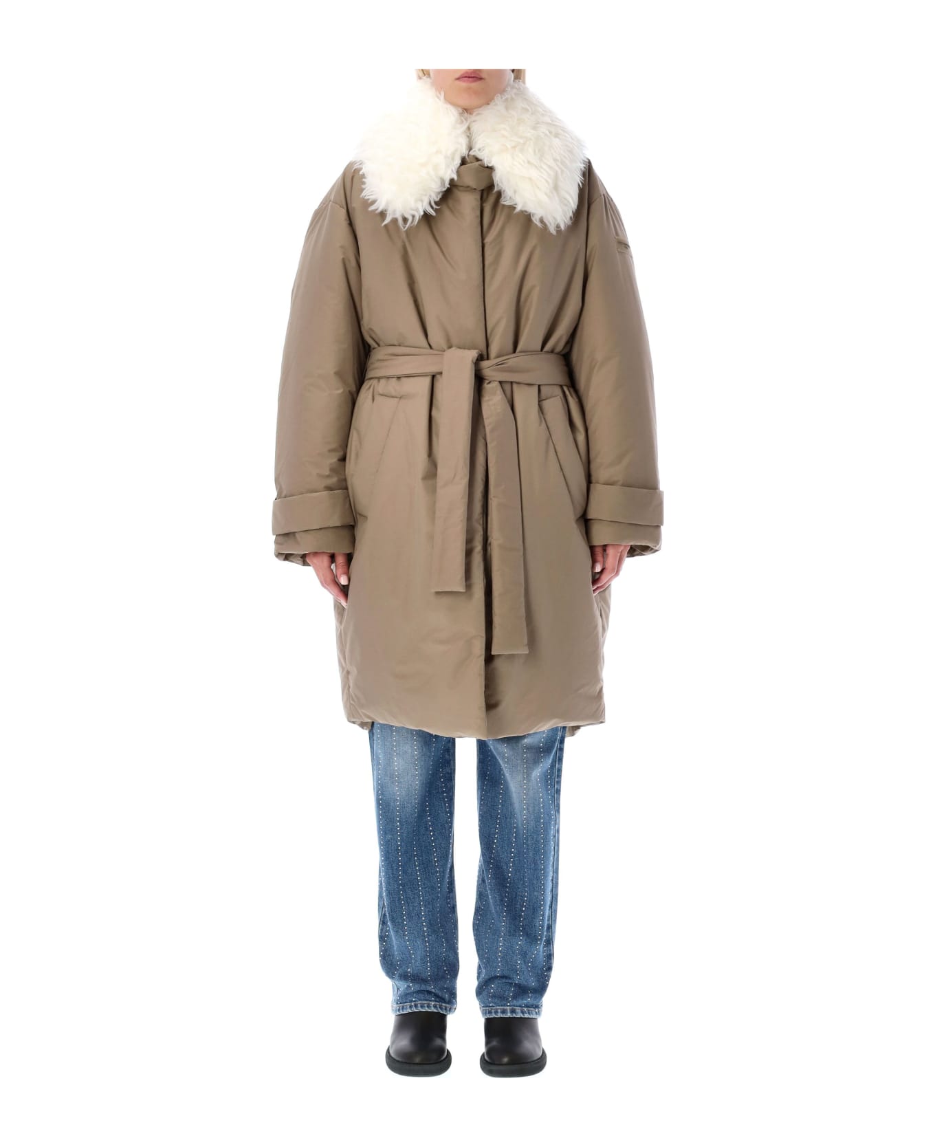 Cotton-blend Padded Parka By Stella Mccartney. Featuring: Removable Hairy Wool Collar Snap Button Fastening Oversize Fit Voluminous Long Sleeves Rubber Logo Patch At Left Sleeve Slit Pockets Self-tie Belt At Waist High Low Hem
