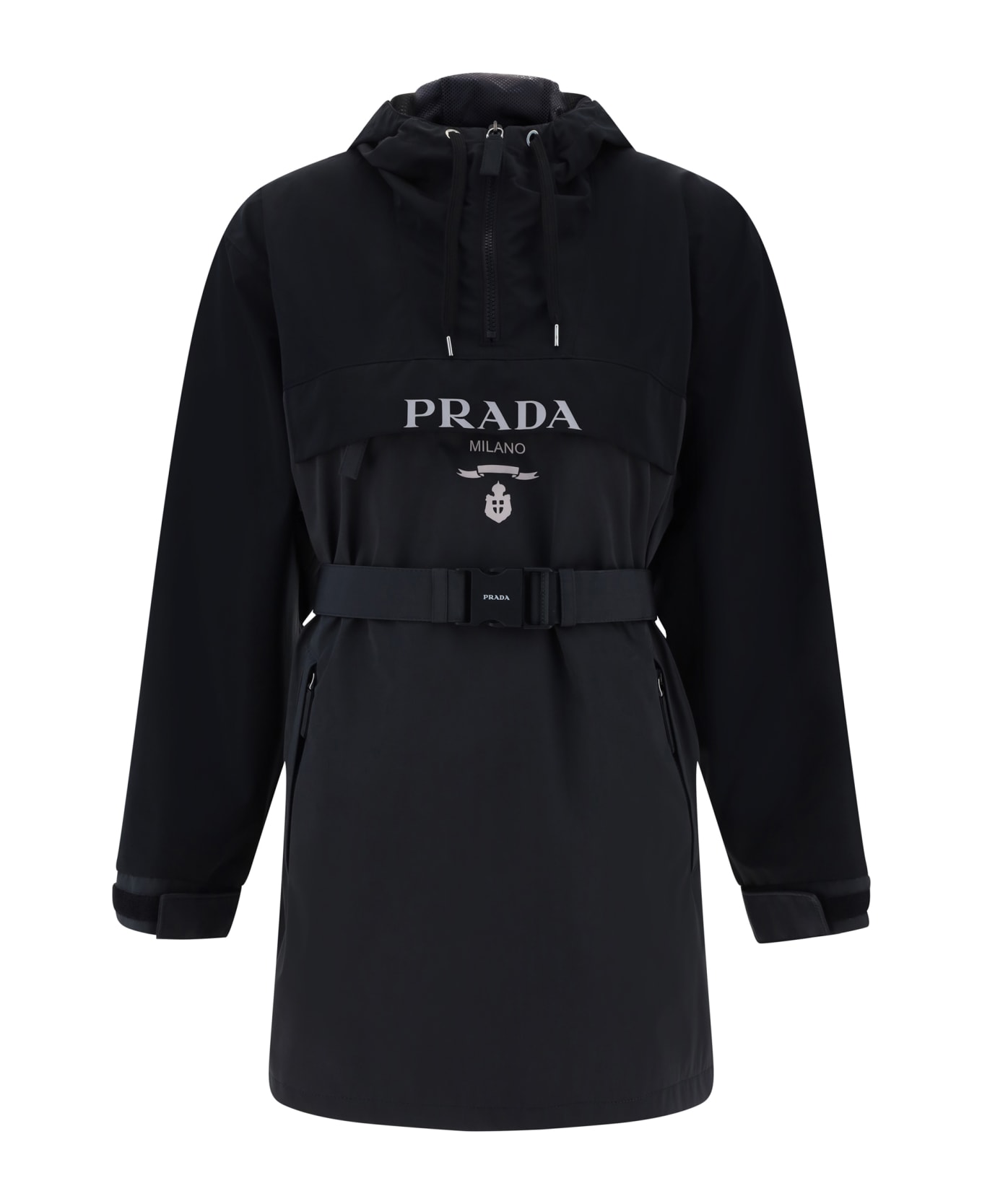 Re-nylon windproof jacket by prada, front zipper closure, model with adjustable hood with drawstring, two side welt pockets with zipper for closure, adjustable cuffs with velcro strap, one slit pocket with zipper on front, waistband with logo buckle, iconic contrasting brand logo on front, regular fit. Composition: 41% % Nylon, 59% % Polyester