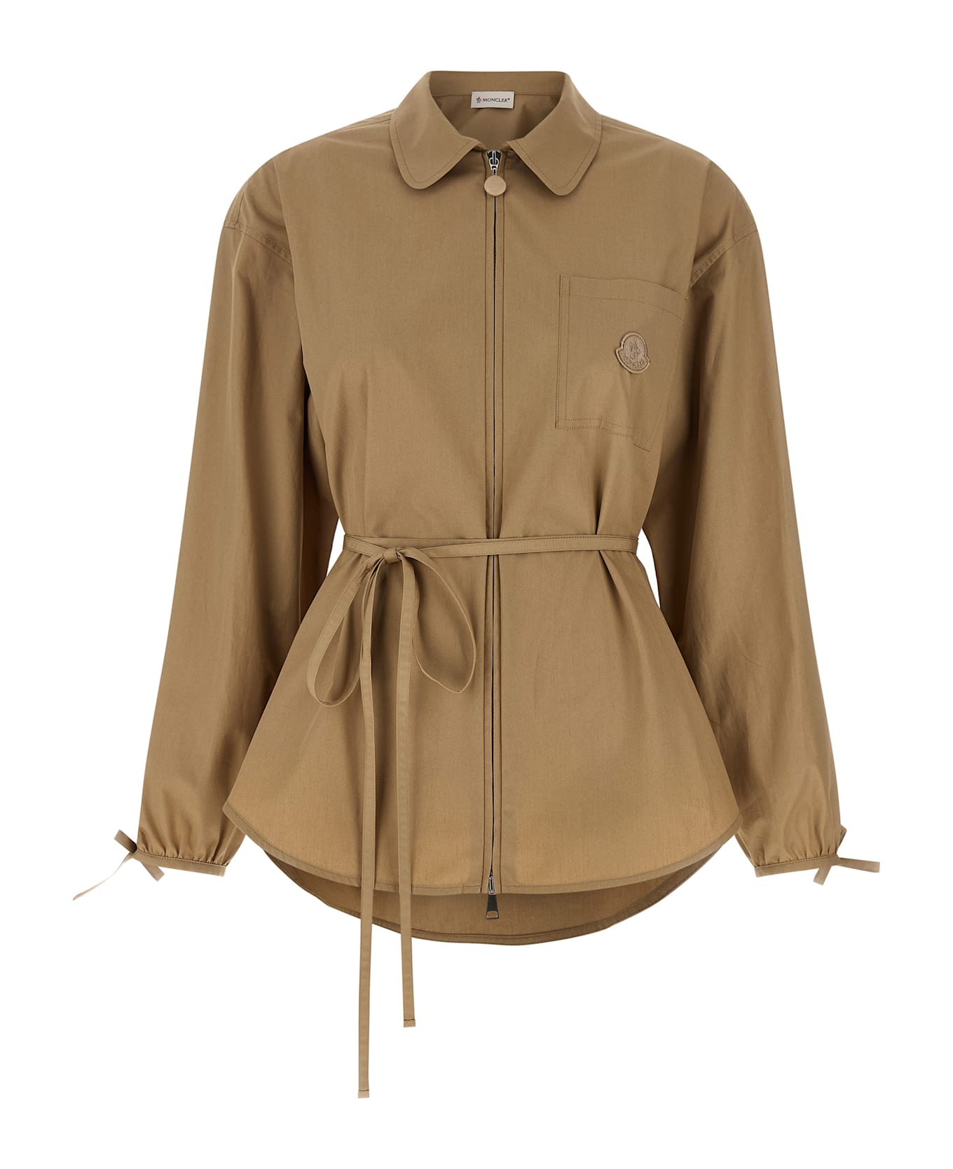 Fresh cotton poplin overshirt, unlined, rounded shirt collar, pocket with tone-on-tone grosgrain logo patch, front zip closure, long sleeves with dropped shoulder and slit and drawstring on the cuffs, rounded hem, removable matching belt.