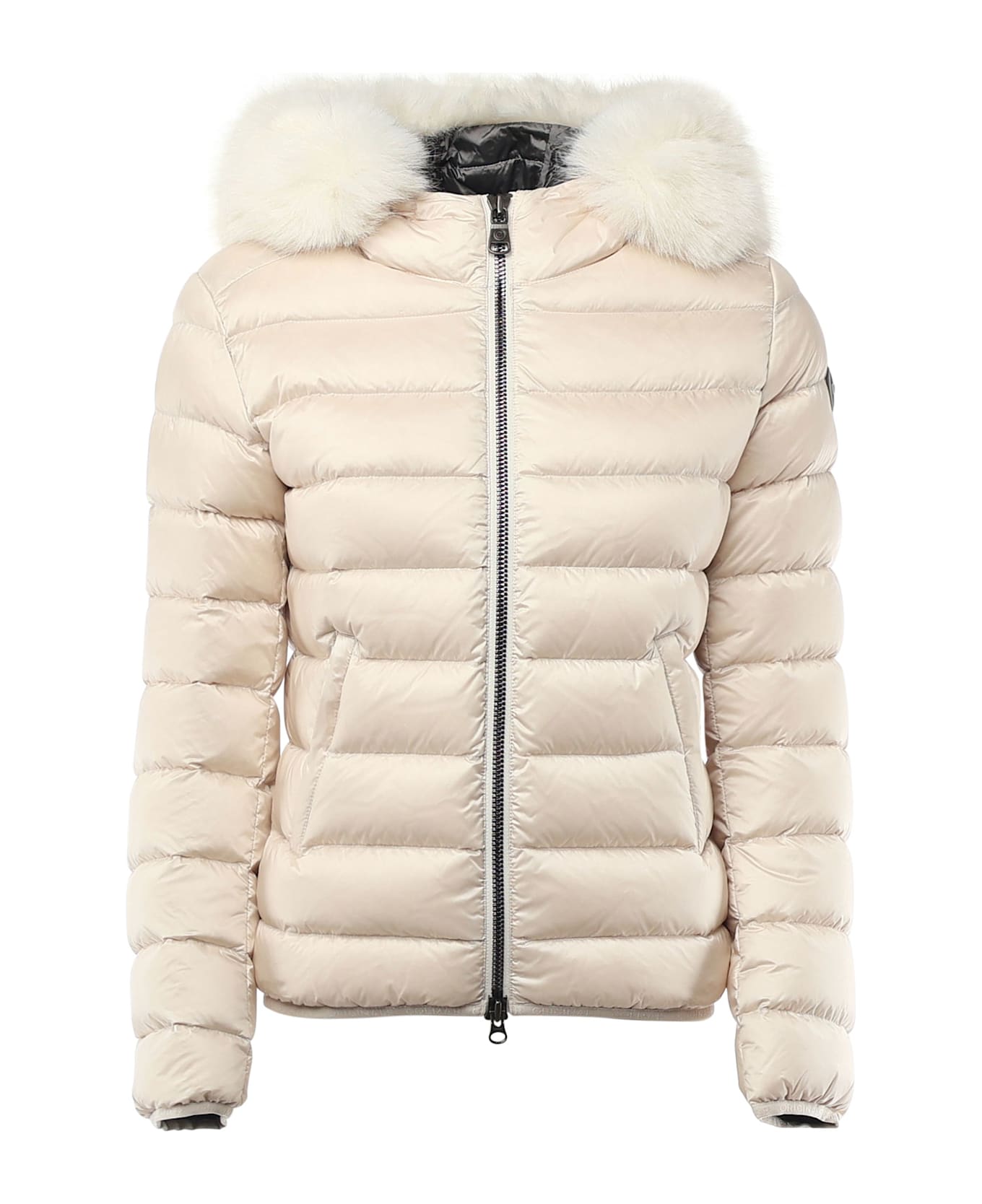 -Regular fit -Zip closure -Side zippered pockets -Fixed hood with fur -Elastic tape on bottom hem and cuffs -Natural down padding -Water-repellent treatment -Applied logo on left sleeve -Color: White